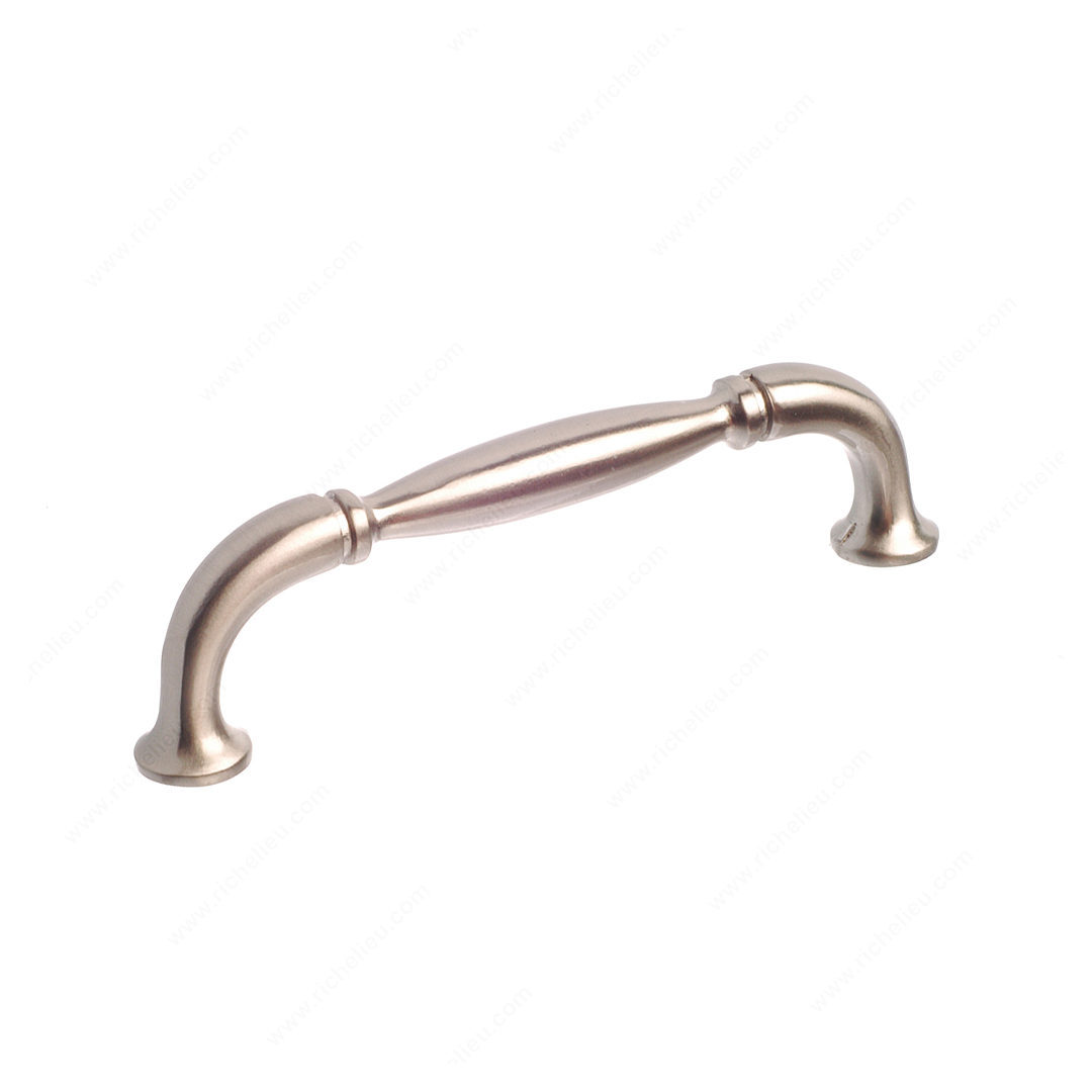 Richelieu BP2373796195 Traditional Metal Pull - 237 is a classic addition to any décor, featuring a delicately arched handle complemented by sturdy flared ends. This metal pull not only enhances the aesthetic appeal of your cabinetry but also offers a comfortable grip, making it a practical choice for any space. With a center-to-center measurement of 3 25/32 inches, this pull is designed to fit seamlessly into a variety of projects. The brushed nickel finish (Finish Number: 195) in a sophisticated gray and chrome color scheme ensures durability and timeless elegance, making it suitable for both traditional and contemporary styles. Crafted from high-quality zamak, it promises longevity while maintaining its polished look. The overall dimensions of the pull are 4 11/32 inches in length, 9/16 inches in width, and a projection of 1 3/16 inches, making it a versatile option for cabinets, drawers, and furniture. Each pull comes with an 8/32-inch screw for easy installation. Whether you’re upgrading your kitchen or refreshing your furniture, the Richelieu Traditional Metal Pull provides the perfect finishing touch. This product ships via UPS for your convenience, ensuring a smooth and efficient delivery process.