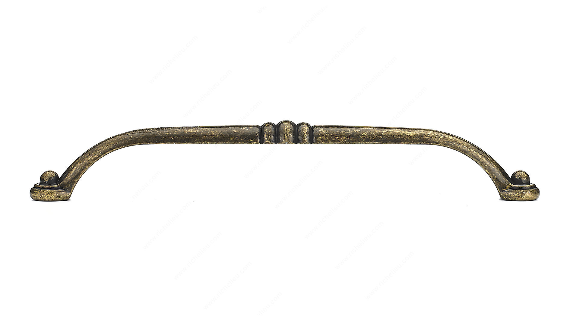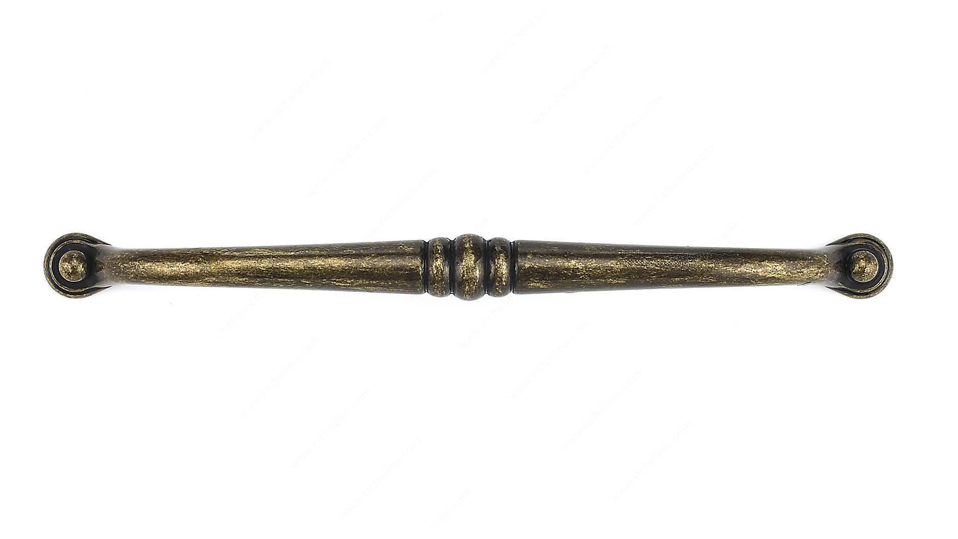 Richelieu BP23738192BB Traditional Metal Pull - 2373 showcases a classic design that effortlessly enhances the aesthetic of your kitchen or bathroom. With its delicate yet rustic detailing, this pull embodies a timeless elegance that complements various décor styles. The burnished brass finish adds a touch of warmth and sophistication while ensuring durability and longevity. Measuring 8 3/16 inches in overall length, the pull features a center-to-center spacing of 7 9/16 inches, making it ideal for standard cabinet sizes. The overall projection of 1 5/16 inches ensures comfortable grip, while the width of 9/16 inch maintains a sleek profile. Crafted from high-quality metal, this pull guarantees both strength and style. Richelieu includes the necessary 8/32 inch screws for easy installation, allowing you to enhance your cabinetry with minimal effort. The combination of yellow and brass hues gives it a unique character, making it a standout choice for anyone looking to update their space. Whether you're renovating your home or simply seeking to refresh your cabinetry, the Richelieu BP23738192BB Traditional Metal Pull offers a perfect blend of function and design, making it an excellent addition to your finishing touches.