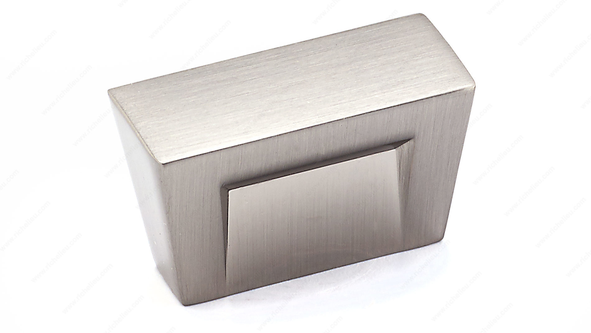 Richelieu BP31632330195 Modern Metal Knob - 3163 elevates your furniture and home décor with its striking design. Crafted from durable zamak, this knob features a refined rectangular shape that adds a contemporary touch to any space. The brushed nickel finish, complemented by a stylish gray and chrome color palette, makes it an eye-catching choice for modern interiors. With an overall length of 1 3/16 inches and a width of 1/2 inch, this knob is perfectly sized for a variety of applications, from cabinetry to furniture. The 5/8-inch center-to-center measurement ensures compatibility with standard installations, while the 23/32-inch projection provides a comfortable grip. Each knob is packaged in a convenient bag, and includes an 8/32 inch screw for easy installation. Whether you're renovating a kitchen, updating a bathroom, or refreshing your living space, the Richelieu Modern Metal Knob is an excellent choice that combines functionality with aesthetic appeal. Its contemporary design not only enhances the visual appeal of your furniture but also offers a durable solution for everyday use. Upgrade your cabinetry with this stylish knob and experience the difference in your home’s ambiance.