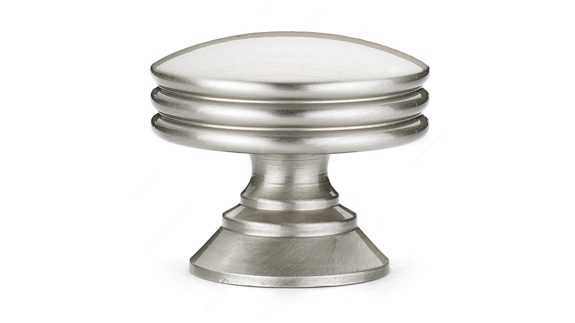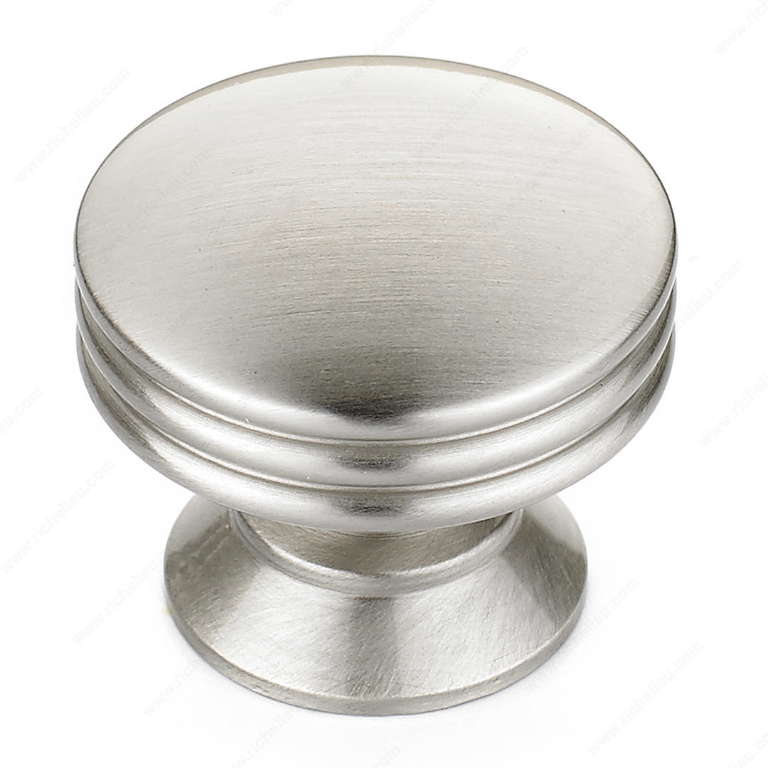 Richelieu BP356011195 Modern Metal Knob - 3560 showcases a unique design that combines functionality with contemporary aesthetics. Its slightly domed face and ribbed edge set against a flared base make this knob an ideal choice for furniture and cabinets featuring clean, straight lines. Crafted from durable metal, this knob offers a brushed nickel finish that not only enhances its modern appeal but also ensures longevity and resistance to wear. Measuring 1 3/16 inches in overall diameter and with a base diameter of 7/8 inch, it fits comfortably in hand, allowing for easy operation. The overall projection of 1 1/32 inches ensures that it adds just the right amount of depth to your cabinetry without being obtrusive. Available in a striking gray and chrome color combination, this knob effortlessly complements various design themes. The included 8/32 inch screw makes installation straightforward, allowing you to refresh your space with ease. Whether upgrading your kitchen, bathroom, or living room, the Richelieu BP356011195 Modern Metal Knob is a perfect blend of style and practicality, making it a valuable addition to any home improvement project.