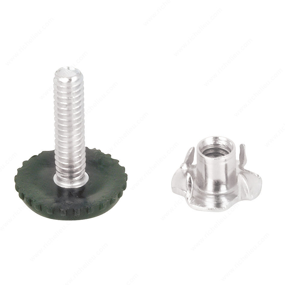 Richelieu BP5390490 1/4''-20 Leveler - Steel/Plastic is designed to provide stability and support for various applications. Crafted from a robust combination of polyethylene and steel, this leveler ensures durability while maintaining a sleek, black finish that seamlessly integrates with modern designs. With an overall height of 1 1/8 inches and a base diameter of 7/8 inch, it is compact yet powerful, capable of supporting loads up to 110 pounds. The threaded stem features a 1/4" - 20 thread size and measures 1 inch in length, making it versatile for use in a range of furniture and cabinetry. The leveler is designed without a slot, offering a clean and streamlined appearance. Each package includes two units, allowing for easy installation and adjustment. Ideal for builders and knowledgeable homeowners alike, the Richelieu BP5390490 leveler is a reliable choice for enhancing the stability of your projects. Designed for easy shipping via UPS, this product combines practicality with efficiency. Whether you're working on a new installation or upgrading existing furniture, this leveler is an essential component for achieving a level and professional finish.