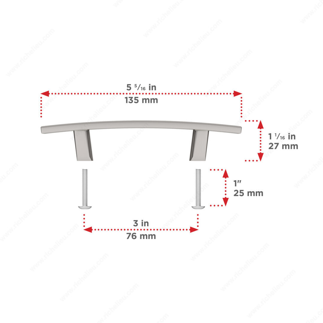 Richelieu BP65076180 Transitional Metal Pull - 650 seamlessly enhances the aesthetic of kitchen and bathroom cabinetry with its elegant design. This pull features a slightly curved shape that brings a touch of sophistication to your interior décor, making it an ideal choice for both modern and classic spaces. Crafted from durable zamak, this pull is built to withstand daily use while maintaining its polished nickel finish. The overall dimensions measure 5 5/16 inches in length, 7/16 inches in width, and a projection of 1 1/16 inches, providing a comfortable grip for easy access. With a center-to-center measurement of 3 inches, the BP65076180 is compatible with standard cabinet configurations. Available in a sophisticated gray and chrome color scheme, this transitional pull complements a variety of design palettes. Each pull comes packaged in a convenient bag, and the necessary 8/32 inch screws are included for easy installation. Whether you’re renovating or simply updating your cabinetry, Richelieu’s BP65076180 Transitional Metal Pull offers a perfect blend of style and functionality, making it a valuable addition to your home improvement projects. Enjoy the effortless elegance it brings to your space.
