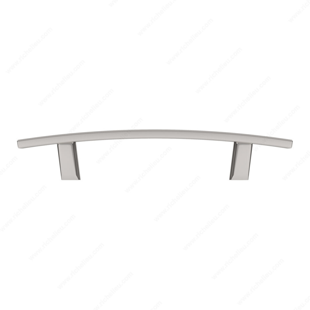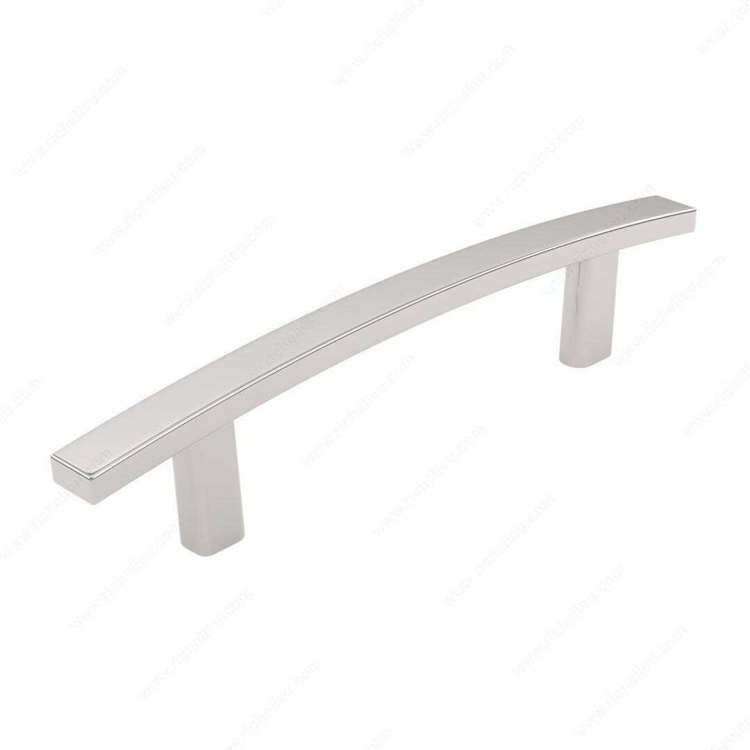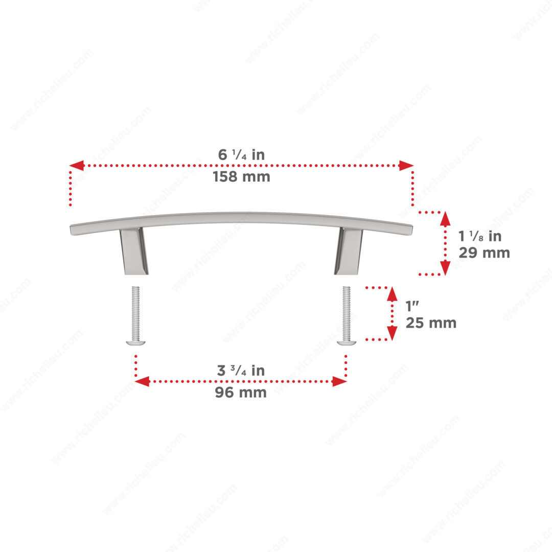 Richelieu BP65096180 Transitional Metal Pull - 650 enhances the aesthetic of kitchen and bathroom cabinetry with its stylish design. This pull features a graceful, slightly curved shape that seamlessly blends functionality with elegance, making it an ideal choice for a variety of interior decors. Crafted from durable zamak, this pull ensures longevity and strength, standing up to daily use while maintaining its polished appearance. With an overall length of 6 7/32 inches and a width of 7/16 inches, it provides a comfortable grip. The center-to-center measurement of 3 25/32 inches allows for straightforward installation, and included 8/32 inch screws facilitate a hassle-free setup. Finished in a sophisticated polished nickel with a gray and chrome color scheme, this transitional pull adds a touch of modernity while remaining versatile enough to complement traditional styles. Measuring 1 5/32 inches in projection, it offers just the right amount of extension for easy access. Packaged in a convenient bag, the Richelieu BP65096180 is ready to ship via UPS, making it easy to incorporate into your next project. Elevate your cabinetry with this distinguished pull that embodies both style and practicality.