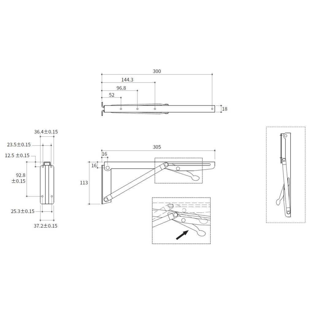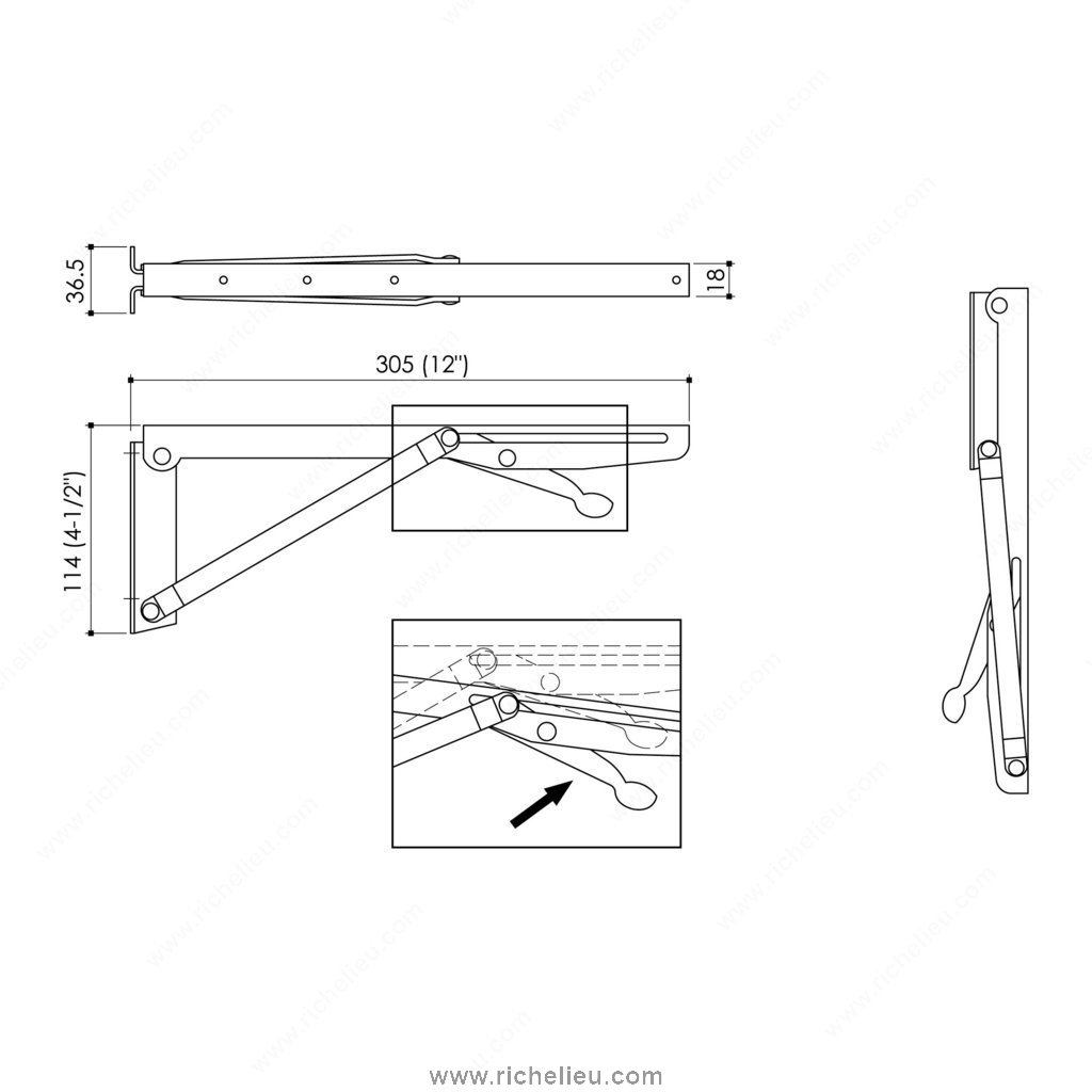 Richelieu BP657730 Folding Support with Extension is the perfect solution for enhancing extension panels in various applications. Designed to provide robust support, this folding support is made of durable steel, ensuring longevity and strength. With a maximum load capacity of 88.2 lbs per shelf, it is built to handle substantial weight while maintaining stability. This product features a sleek white finish, making it an aesthetically pleasing addition to any space. The overall dimensions of the support measure 4 1/2 inches in height and 12 inches in projection, allowing for versatile installation options. It accommodates shelf depths of up to 15 3/4 inches and thicknesses ranging from 5/8 to 3/4 inches, catering to a variety of shelving needs. The visible, anti-tip design adds an extra layer of safety, making it suitable for both residential and commercial environments. Packaged conveniently in a bag, the Richelieu BP657730 can ship via UPS, ensuring efficient delivery to your project site. Ideal for building professionals and knowledgeable homeowners alike, this folding support not only maximizes space but also enhances functionality, making it a valuable addition to any cabinetry or shelving system.