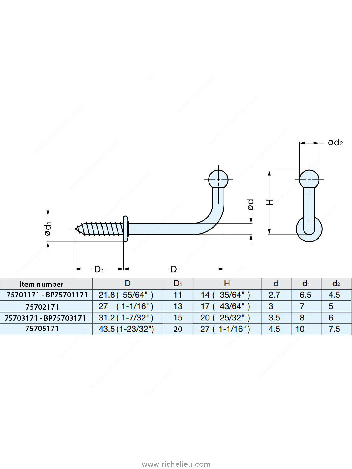 Richelieu BP75703171 Utility Stainless Steel Screw Hook - 7570 offers a practical and efficient solution for your storage needs. These square bend hooks are designed to help you maintain organization in various spaces, from garages to kitchens. Crafted from durable 304 stainless steel, they feature a sleek stainless steel finish that not only enhances their aesthetic appeal but also ensures longevity and resistance to wear. With an overall height of 25/32 inches and a projection of 1 7/32 inches, this utility hook is compact yet capable, boasting a load capacity of 11 pounds. This makes it a reliable choice for hanging tools, kitchen utensils, or other essential items. The hook’s dimensions, measuring 5/16 inches in width, provide versatility in placement without occupying excessive space. One of the standout features of the Richelieu BP75703171 is its simple installation, as no screws are required, allowing for a hassle-free setup. Packaged in a convenient bag of four units, these hooks provide excellent value and functionality for any organization project. Whether you are a building professional or a knowledgeable homeowner, these hooks are the perfect addition to streamline your storage solutions.