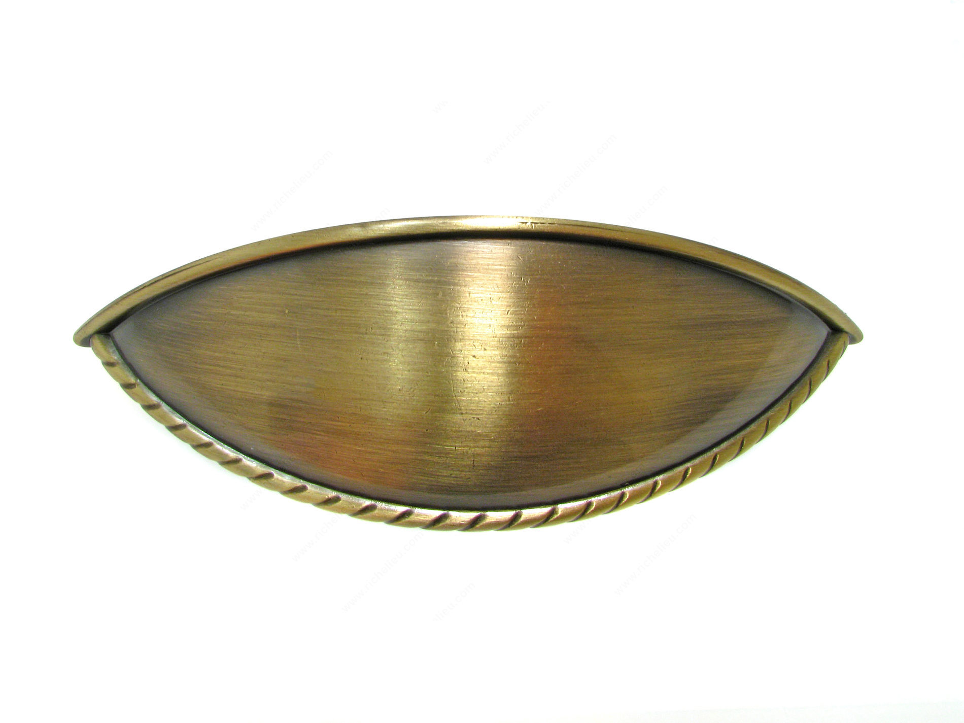 Richelieu BP80237AE Traditional Metal Pull - 8023 is an elegant addition designed to enhance the aesthetic of your kitchen or bathroom. With its classic design and intricate braided rope detail, this cup pull effortlessly draws attention, adding a touch of sophistication to your cabinetry. Crafted from high-quality Zamac, the pull features a stunning Antique English finish that exudes charm and timelessness. Measuring a total length of 5 inches, the pull has a center-to-center measurement of 3 25/32 inches, ensuring compatibility with a variety of cabinet styles. Its dimensions, with a width and projection of 1 5/16 inches, provide a comfortable grip while maintaining a streamlined look. The Richelieu BP80237AE is not only visually appealing but also practical, as it comes complete with 8/32 inch screws for easy installation. The combination of yellow and brass tones in the design complements various color schemes, making it a versatile choice for any renovation project. Elevate your cabinetry and make a lasting impression with this traditional metal pull, which combines functionality and style in one distinguished piece. Ideal for both building professionals and knowledgeable homeowners, this pull is sure to enhance any space with its refined elegance.