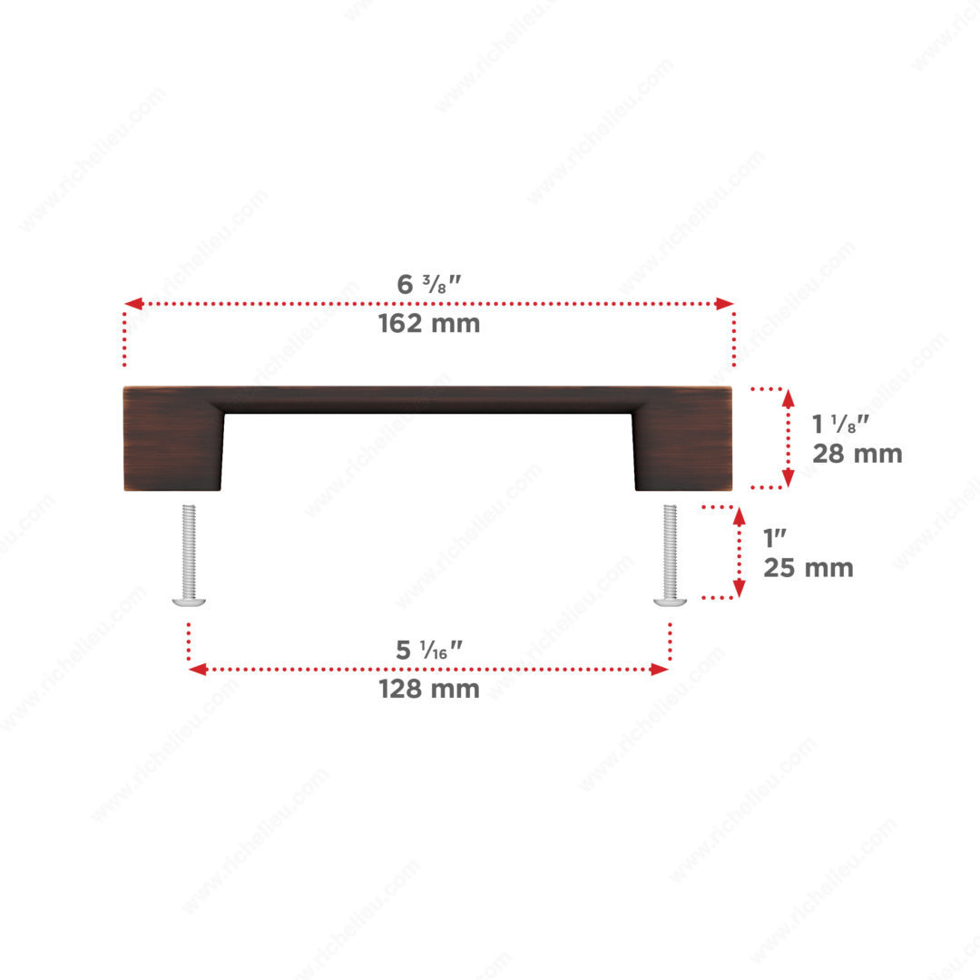 Richelieu BP8160128BORB Modern Metal Pull - 8160 enhances the elegance of your cabinetry with its sleek, minimalist design. Crafted from durable zamak, this modern pull features a brushed oil-rubbed bronze finish that effortlessly complements a variety of interior styles. With an overall length of 6 3/8 inches and a center-to-center measurement of 5 1/32 inches, it is ideal for both cabinet doors and drawer fronts. Available in eight finishes, including options for 12- and 18-inch appliance pulls, the versatility of the 8160 model makes it easy to find the perfect match for your project. The 1-1/4 inch handle can serve as a stylish knob, or you can pair it with a matching finish knob for a cohesive look. With a projection of 1 3/32 inches and a width of 5/16 inches, the pull is designed for comfortable grip and functionality. Each pull comes with 8/32 inch x 25 mm screws for easy installation, ensuring that you can achieve a professional finish in no time. Whether you’re updating a space or designing a new one, the Richelieu BP8160128BORB is an excellent choice for adding modern sophistication to your environment.
