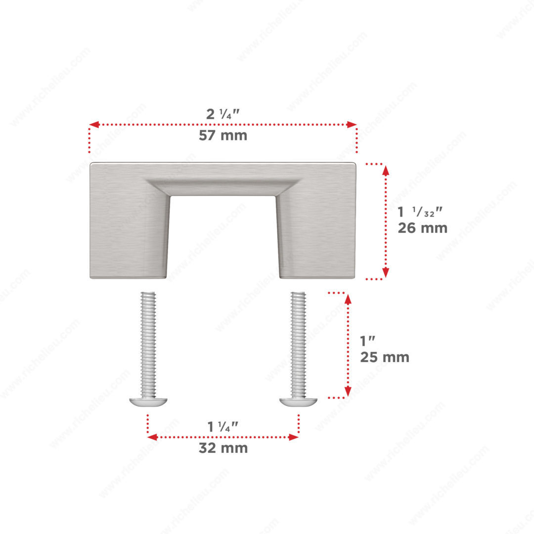 Richelieu BP816032195 Modern Metal Pull - 8160 brings a sophisticated touch to your cabinetry with its sleek, modern design. Crafted from durable Zamak, this pull features simple, straight lines that seamlessly complement a variety of décor styles, making it a versatile choice for any kitchen or living space. Available in eight exquisite finishes, including the elegant Brushed Nickel (Finish Number: 195), this model caters to diverse design preferences. The pull offers a center-to-center measurement of 1-1/4 inches, and is also available in longer lengths, such as 12- and 18-inch appliance pulls, ensuring it meets your specific needs. Measuring 2-1/4 inches in length and 5/16 inches in width, it has a projection of 1-1/32 inches, providing a comfortable grip. The pull can be used on its own or paired with a matching knob from the suggested products for a cohesive look. Each pull comes with screws (8/32 in x 25 mm) included for easy installation. Shipped conveniently via UPS, the Richelieu BP816032195 Modern Metal Pull is an ideal choice for both building professionals and discerning homeowners seeking to elevate their interior design with functional elegance.
