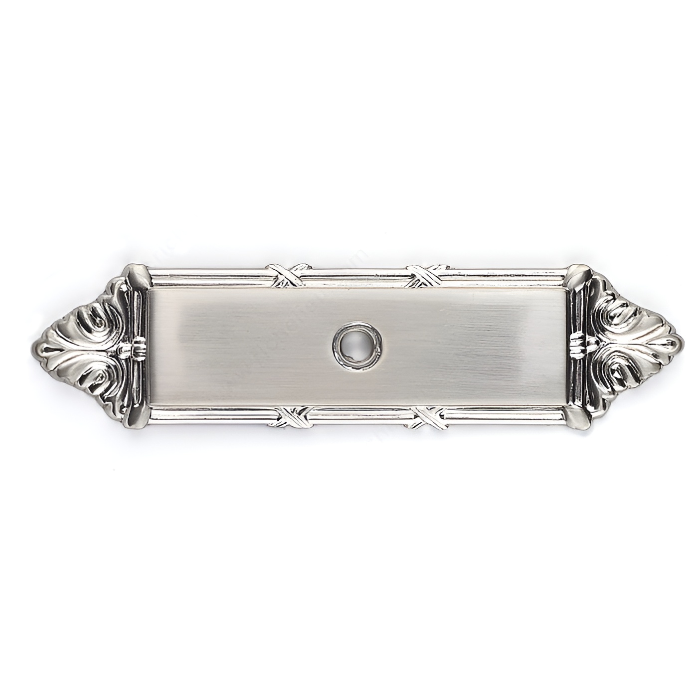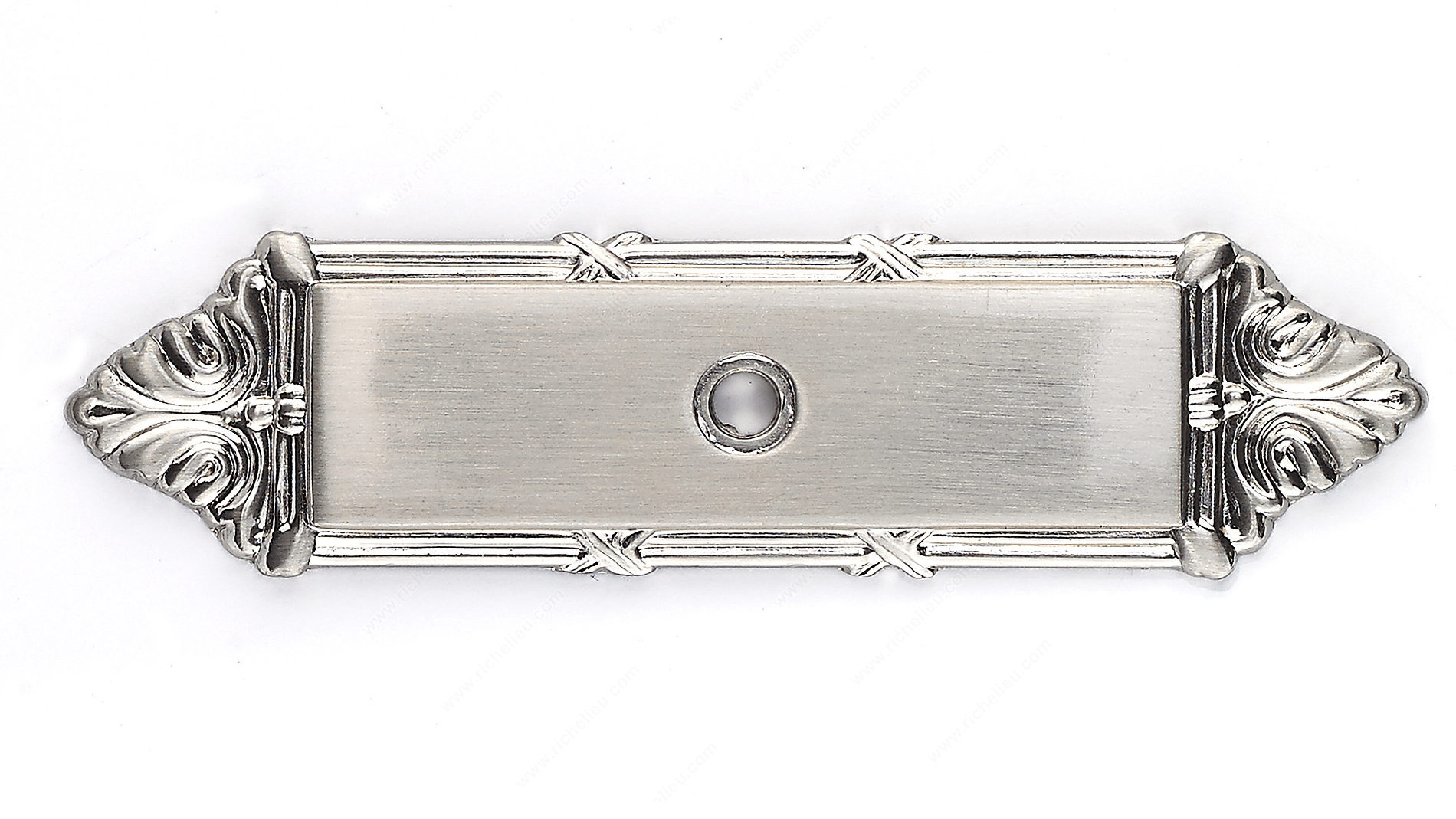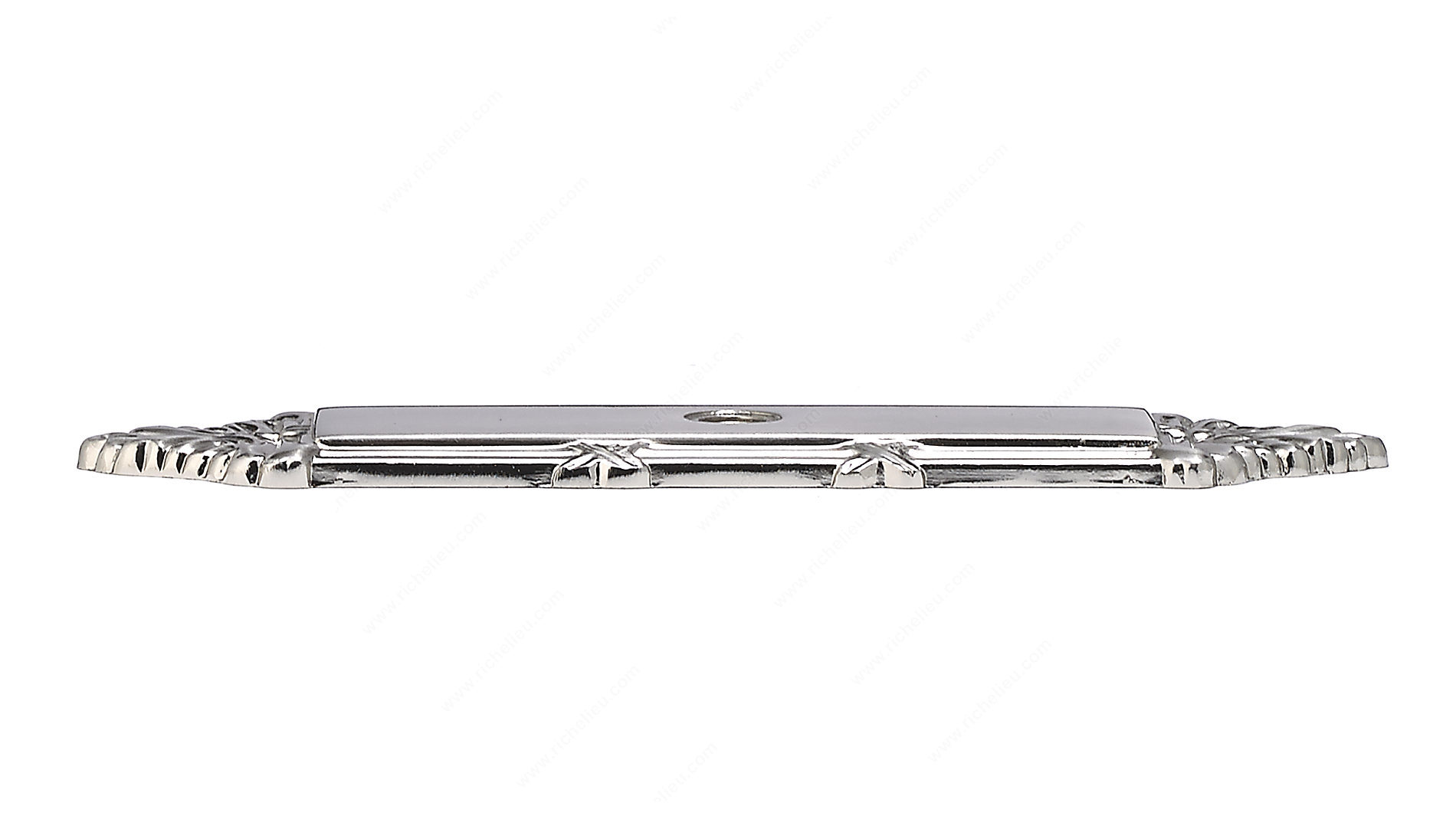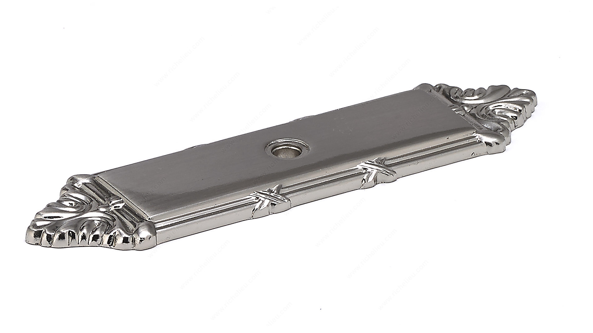 Richelieu BP82908195 Traditional Metal Backplate for Knob - 8290 offers a refined touch for your cabinetry. Designed with a classic aesthetic and embellished edging, this backplate enhances the visual appeal of kitchen or bathroom cabinets, making it a perfect choice for both modern and traditional interiors. Crafted from durable Zamak, this backplate ensures longevity while maintaining its sophisticated look. The brushed nickel finish adds a subtle sheen, blending seamlessly with gray and chrome elements in your decor. With overall dimensions of 4 3/16 inches in length and 1 3/32 inches in width, this backplate is designed to complement traditional-style pulls and knobs, elevating the overall design of your cabinetry. The projection of 3/16 inches provides a sleek profile that fits well in any setting. Additionally, the BP82908195 model does not require screws or nails for installation, simplifying the setup process. Whether you are renovating your kitchen or updating your bathroom, this elegant backplate is an ideal choice for adding a touch of sophistication and style. Trust Richelieu's commitment to quality and design to enhance your home’s decor with this stunning backplate.