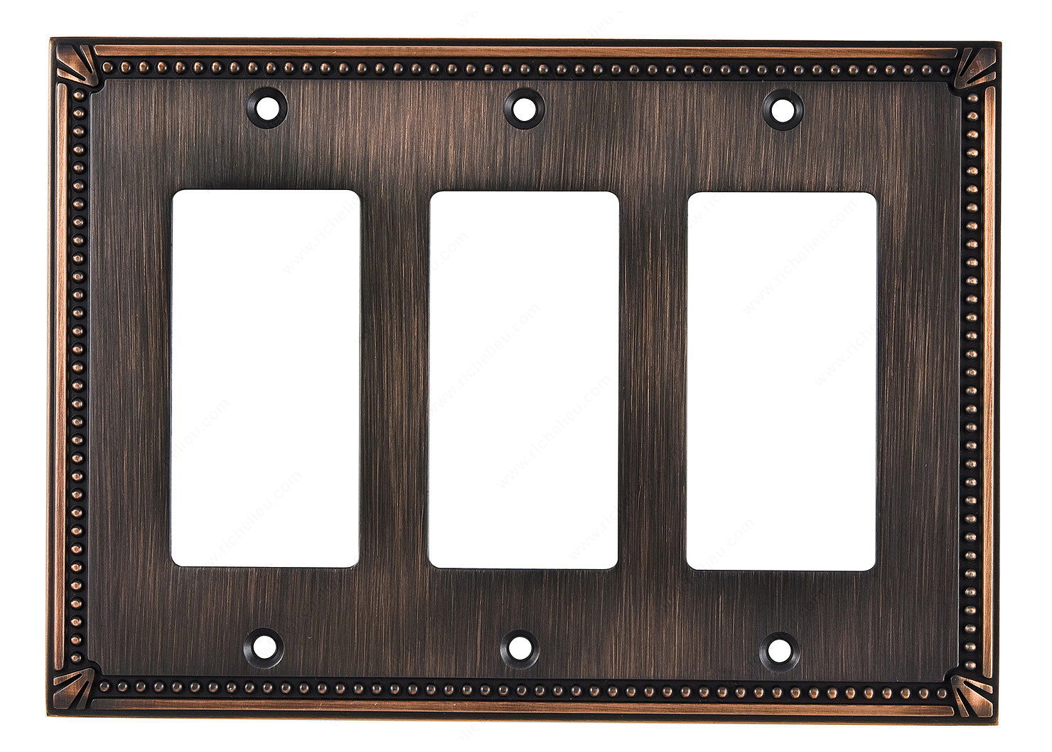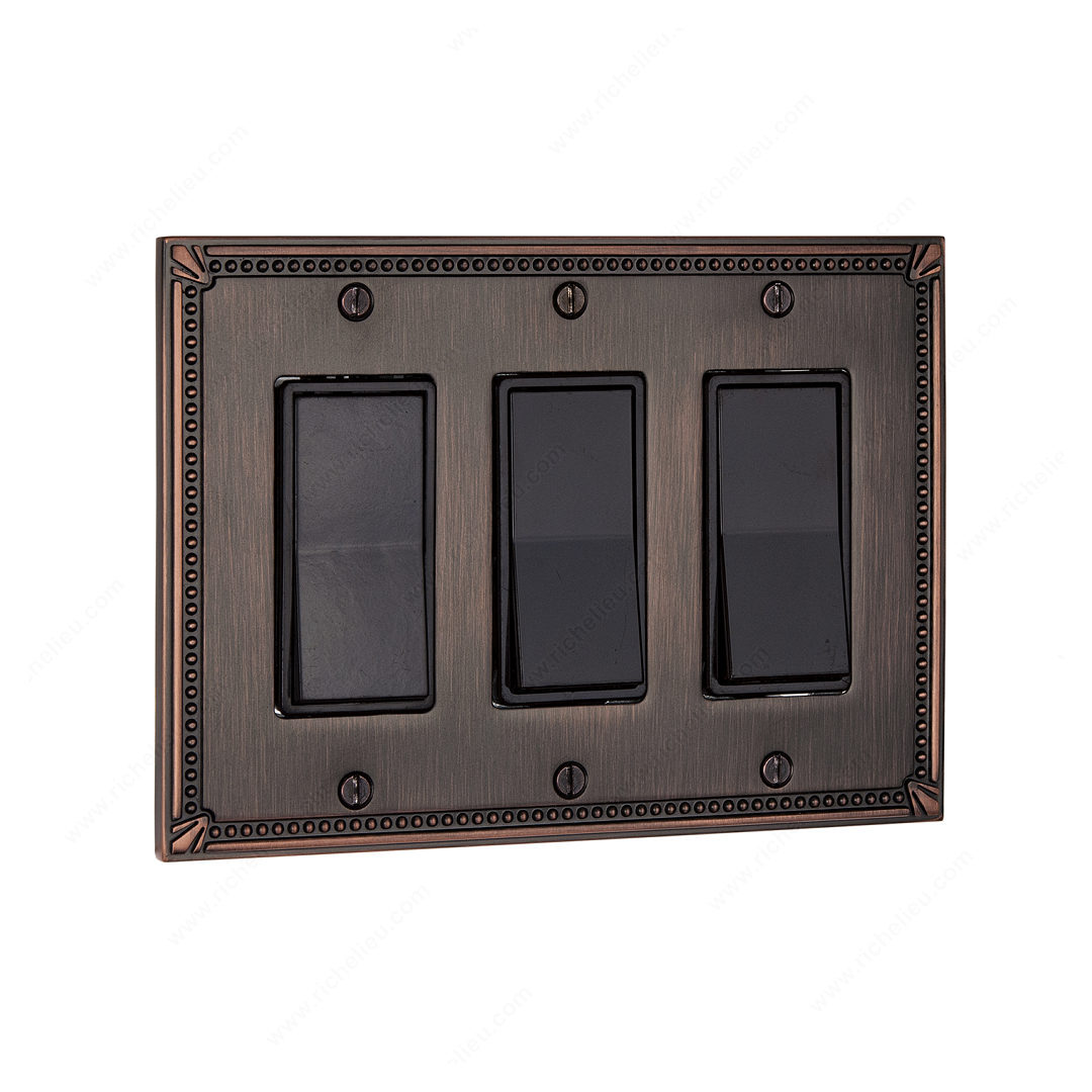 Richelieu BP86111BORB Switch Plate 3 Decora - Traditional Style is designed to elevate the aesthetic of any space with its elegant and timeless appeal. This switch plate features a classic rectangular shape, complemented by intricate detailing around the edges that adds a touch of sophistication to your décor. Finished in a rich, brushed oil-rubbed bronze, it exudes warmth and character, making it an ideal choice for both traditional and modern interiors. Measuring 4 27/32 inches in height and 6 25/32 inches in width, this switch plate offers a perfect fit for standard electrical outlets, ensuring a seamless integration into your home. The 1/4-inch projection provides a subtle yet defined presence on your walls. Crafted from durable metal, this product not only enhances style but also promises longevity and reliability. Installation is hassle-free with included screws, allowing you to effortlessly update your space. The combination of brown and bronze tones creates a versatile look that pairs beautifully with various color schemes and furnishings. Elevate your interior with the Richelieu BP86111BORB Switch Plate, where functionality meets classic design, making it an essential addition to your home improvement project.