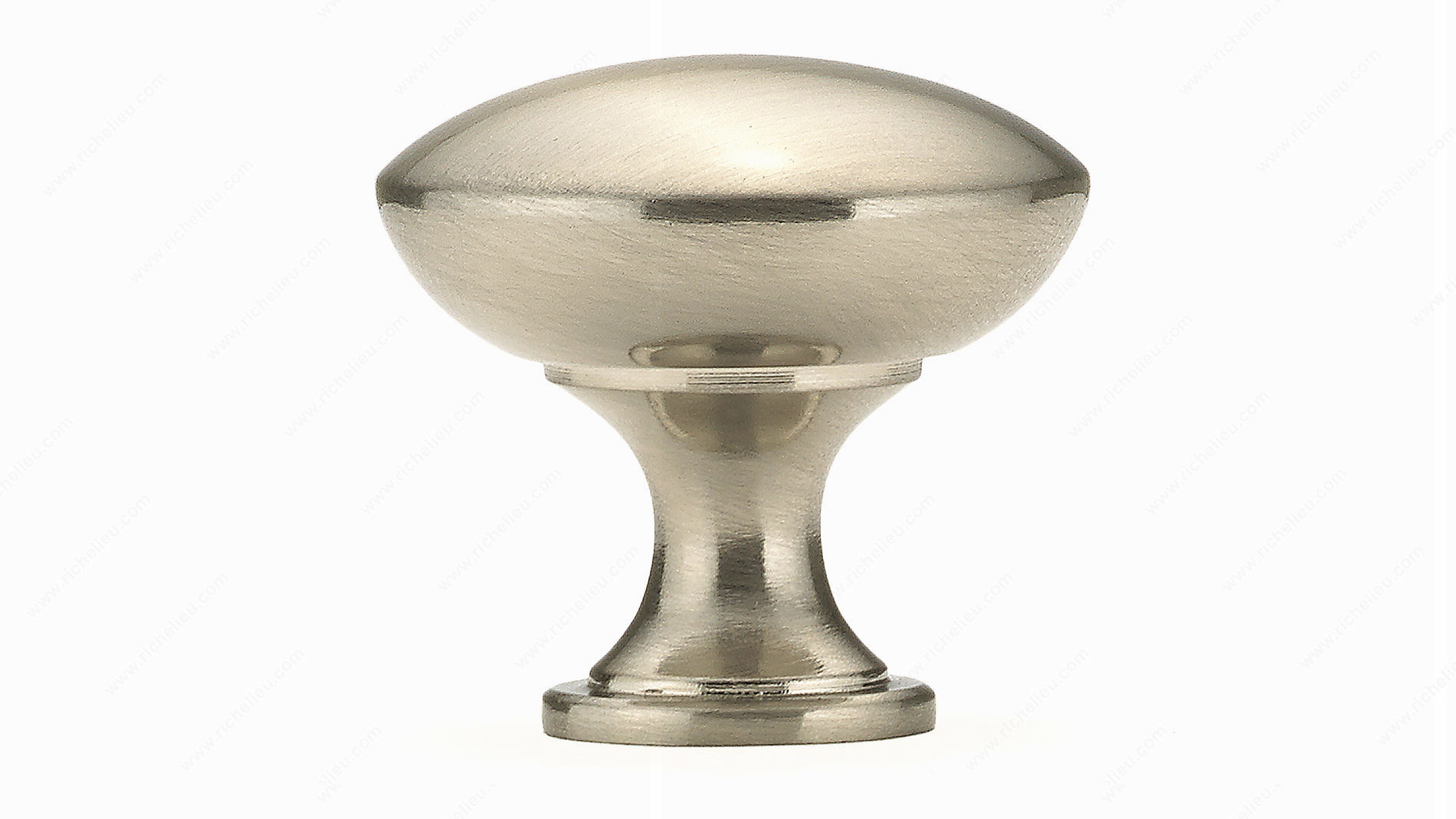 Richelieu BP9041195 Modern Metal Knob - 9041 is a contemporary addition that effortlessly enhances your kitchen or bathroom décor. With its flared base design, this knob not only serves a functional purpose but also acts as a stylish accent, making it an ideal choice for modern interiors. Measuring 1 3/16 inches in diameter and featuring a base diameter of 5/8 inches, this knob is crafted from durable Zamak material, ensuring longevity and resistance to wear. The brushed nickel finish adds a touch of sophistication, while the gray and chrome color combination allows it to blend seamlessly with various design palettes. The overall projection of 1 3/32 inches ensures a comfortable grip, making it practical for everyday use. Each knob is packaged in a convenient bag and includes an 8/32 inch screw for easy installation. Designed under the Urban model line, the BP9041195 is perfect for those seeking utility with a modern flair. Whether you're updating cabinetry or enhancing furniture pieces, this knob is a versatile choice that reflects contemporary style and quality. Choose Richelieu for functional hardware that marries design with practicality.