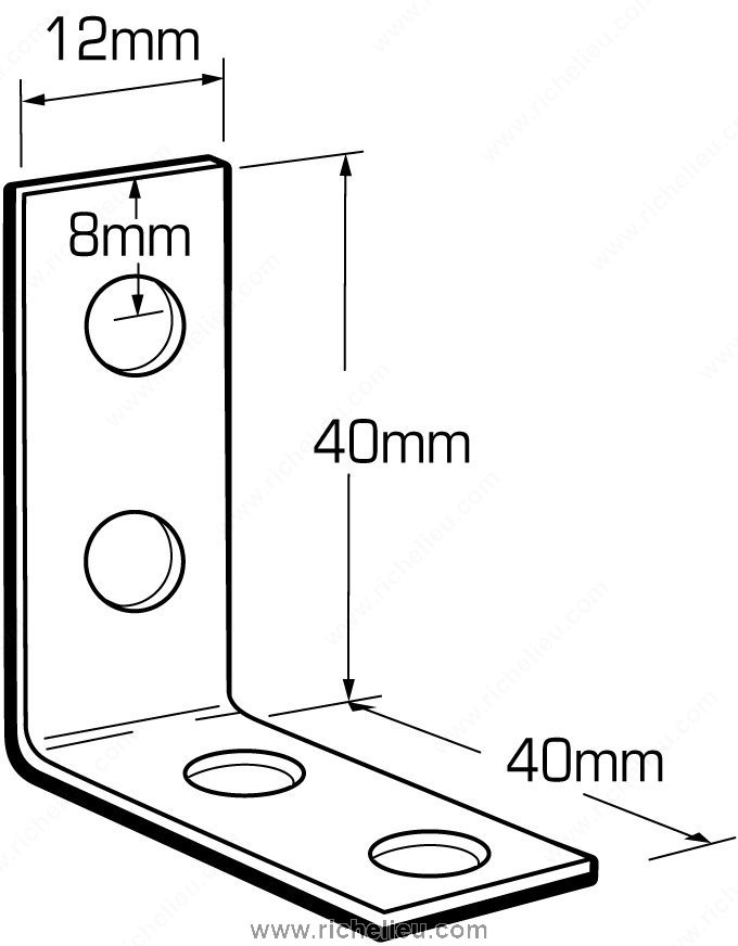 Richelieu CP2372G4 Corner Brace offers reliable support for a variety of indoor and outdoor applications, making it an essential component for furniture assembly and structural reinforcement. Crafted from durable steel, this corner brace boasts a sleek zinc finish that not only enhances its longevity but also ensures a polished look for your projects. With an overall height and projection of 1 37/64 inches, the brace is designed to provide robust right-angle support. The precise thickness of 3/32 inch allows for secure placement without compromising the integrity of the materials it reinforces. Additionally, the countersunk screw holes enable screws to sit flush with the brace, contributing to a smooth, streamlined appearance. Packaged conveniently in a box of 100 units, the Richelieu CP2372G4 is perfect for professionals and DIY enthusiasts alike, ensuring you have enough braces for large-scale projects. While screws are not included, the brace is compatible with standard fasteners, allowing for easy integration into your designs. Whether you're reinforcing furniture or addressing structural needs, the Richelieu CP2372G4 Corner Brace combines strength, functionality, and elegance, making it a valuable addition to your hardware collection.