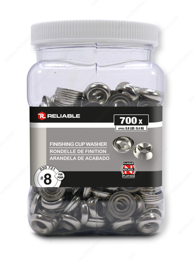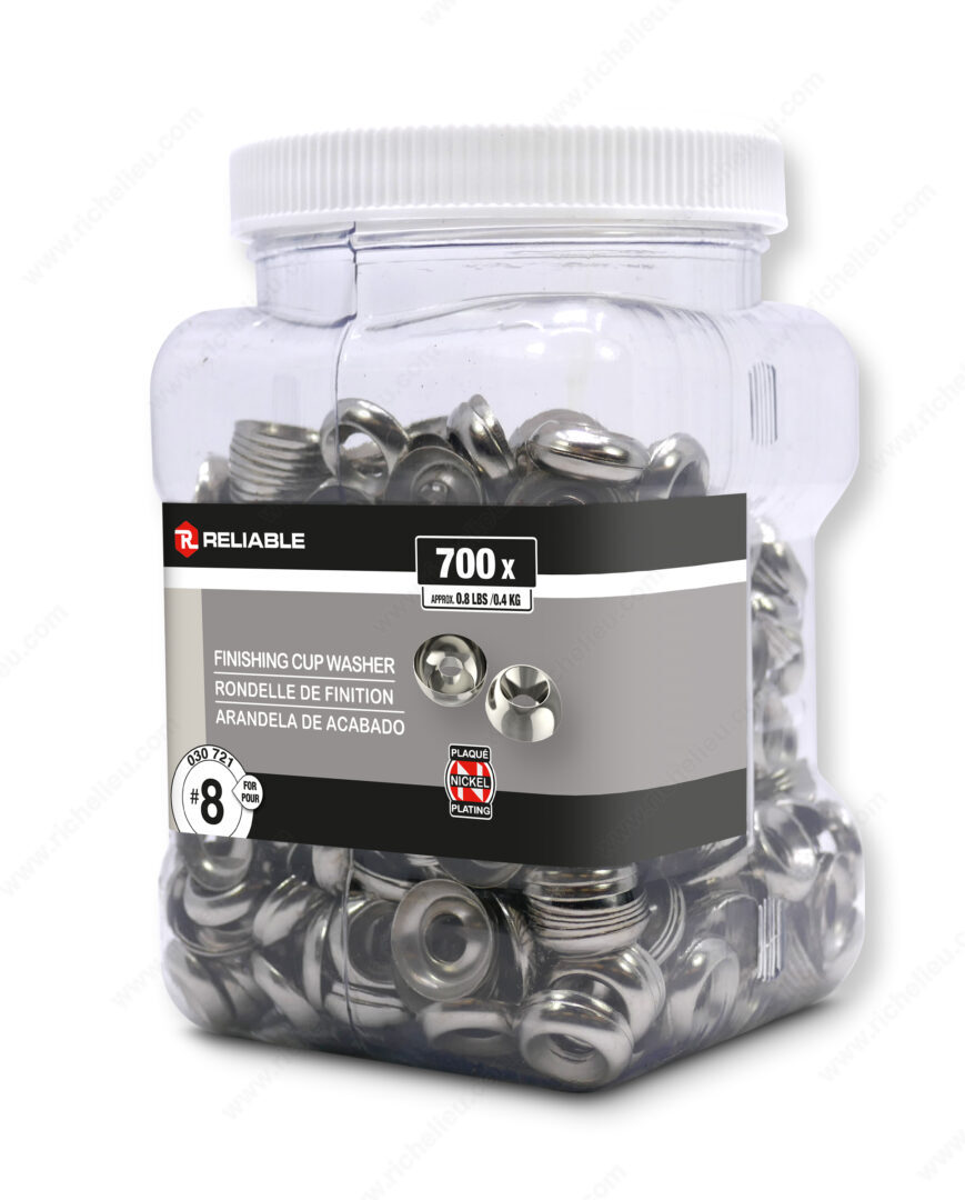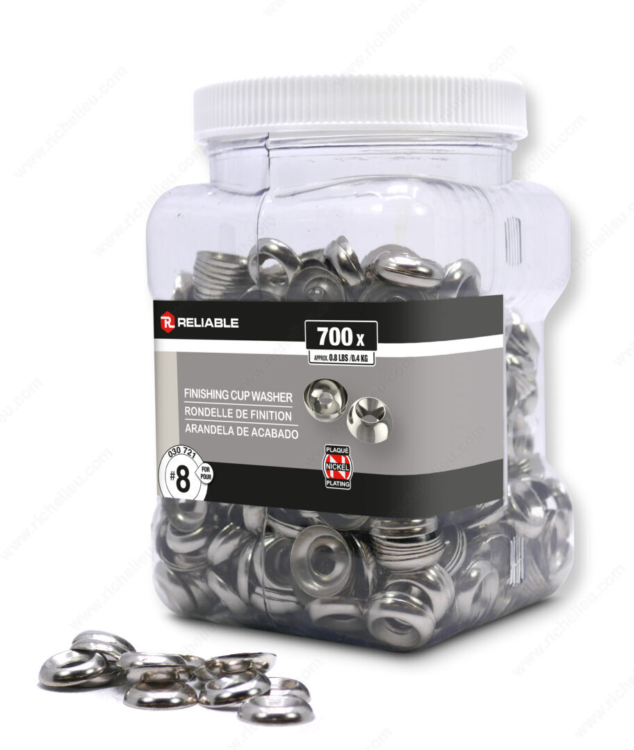 Richelieu FCN8J Finishing Cup Washer - Nickel offers a sophisticated solution for enhancing the aesthetic appeal of your fasteners. Crafted from durable nickel-plated steel, these finishing washers deliver not only a polished look but also added resistance to ensure the longevity of your installations. Designed specifically for bolts with a diameter of number 8, these washers provide a snug fit, contributing to a clean, recessed appearance that is both functional and visually pleasing. Measuring an inside diameter ranging from 0.00709 to 0.00866 inches and an outside diameter between 0.0204 and 0.0214 inches, the FCN8J washers maintain a thickness of 0.00339 to 0.00433 inches, making them ideal for a variety of applications. Packaged in a convenient box of 700, these trim ring washers are perfect for large projects or bulk needs, ensuring you have the right components on hand. With their combination of style and durability, Richelieu FCN8J Finishing Cup Washers are an excellent choice for professionals and knowledgeable homeowners looking to enhance their hardware installations while maintaining a high standard of quality. These washers ship easily via UPS, making them a practical addition to your supply inventory.