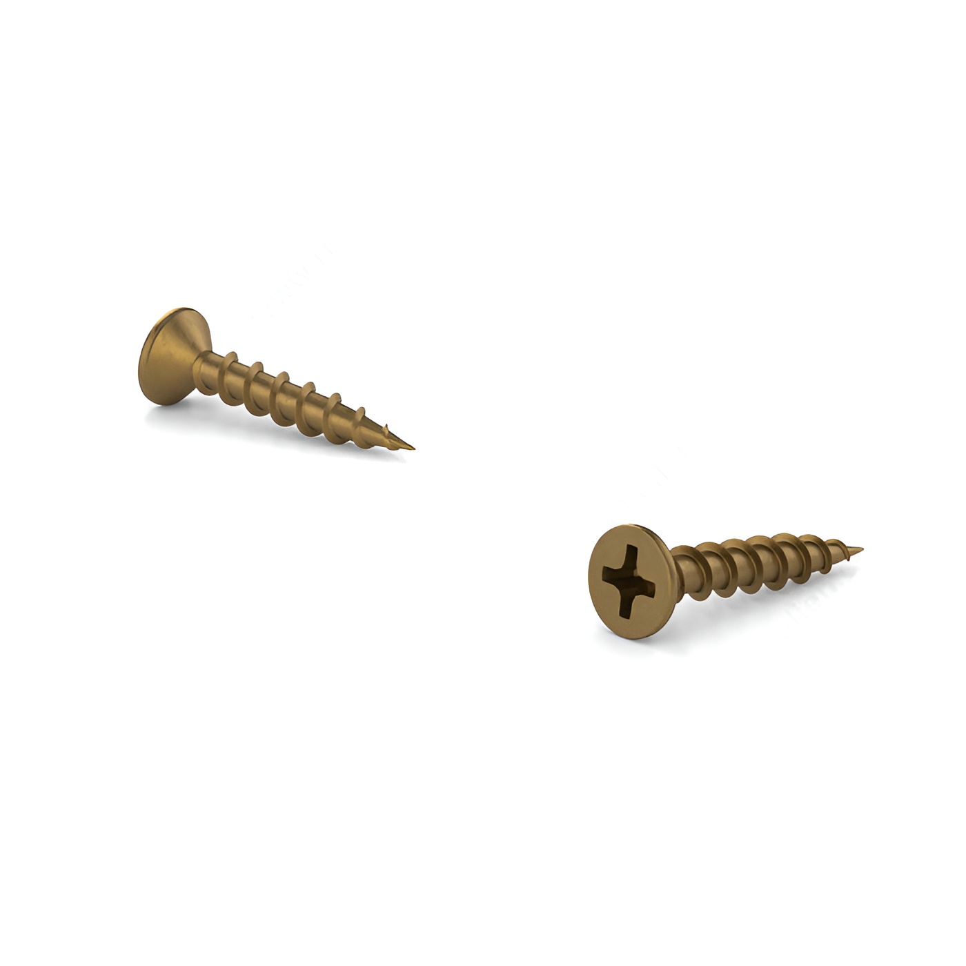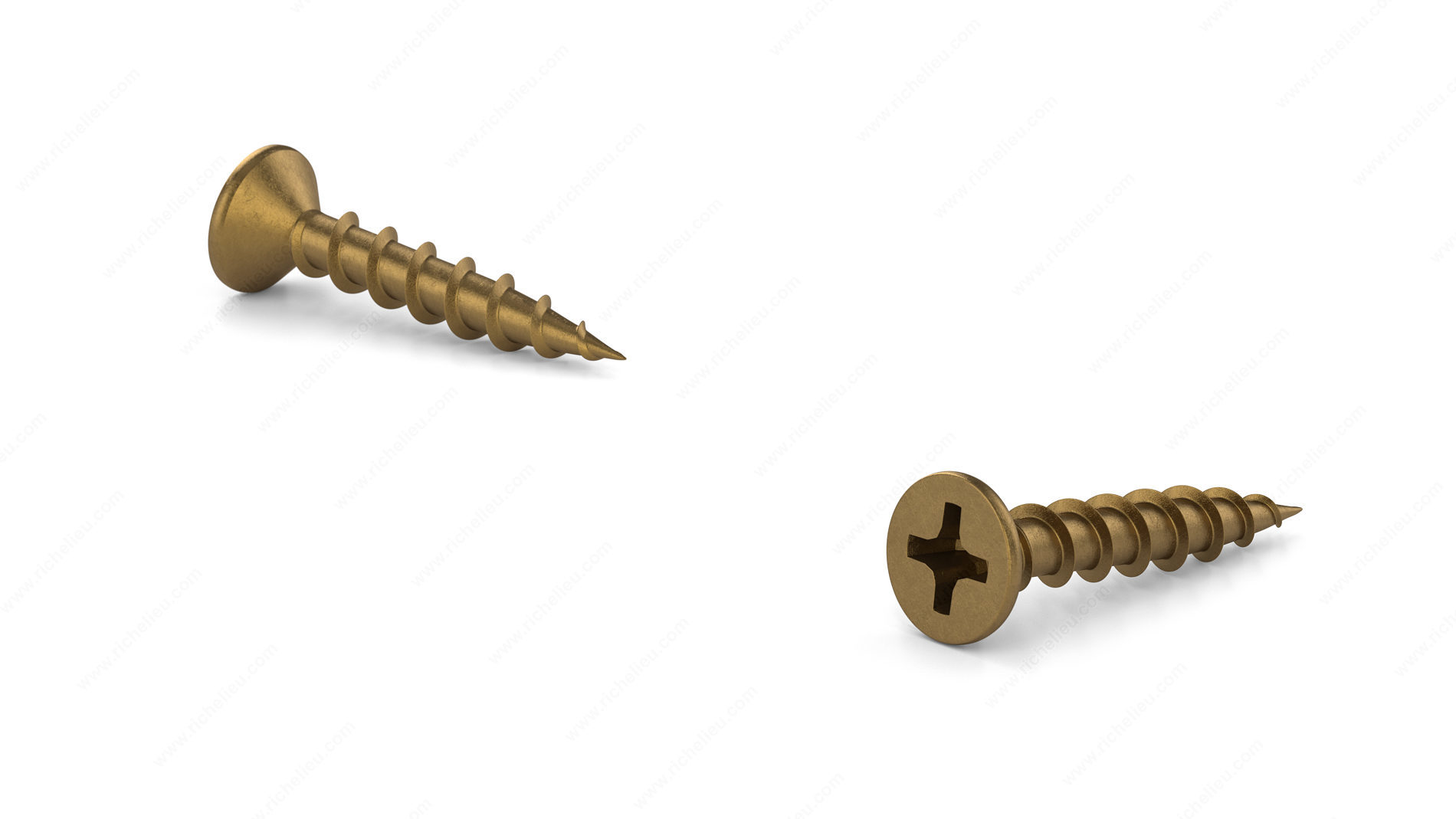 Richelieu FPCAB658PRM1 Wood Screw, Flat Head, Phillips Drive, Coarse Thread, Regular Wood Point is a versatile fastening solution ideal for general use with all types of wood, plywood, and particle board. Engineered for performance, these screws feature a flat head design and a Phillips drive, allowing for easy installation that can be driven flush to the surface or countersunk, ensuring a clean finish for your projects. Constructed from durable steel, these screws are offered in a rich antique brass finish that adds an elegant touch to any application. With a length of 5/8 inch and a screw size of 6, they are perfect for tasks involving slides and hinges, making them an essential addition to your hardware collection. The screws have a coarse threading with a thread count of 12, providing excellent grip and stability in softwood and engineered wood materials. Packaged conveniently in a box of 1000, the Richelieu FPCAB658PRM1 screws are not only reliable but also an economical choice for both professionals and knowledgeable homeowners. Whether you are working on furniture assembly or cabinetry, these screws will meet your needs with efficiency and style.