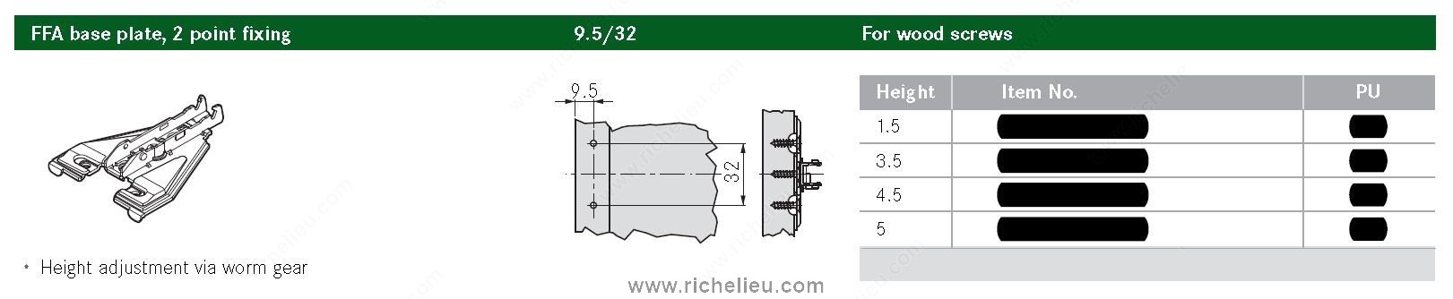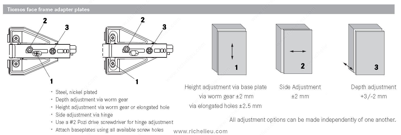 Richelieu GRT825 Face Frame Base Plates provide a reliable solution for securing cabinetry and furniture in various applications. Designed by Grass, these base plates are engineered for durability and ease of installation. With a compact height of just 1/16 inch, they seamlessly integrate into your projects without adding bulk, maintaining the sleek appearance of your designs. The GRT825 features a screw-in mounting method, ensuring a secure and stable fit that is essential for face frame applications. This two-point attachment system enhances stability, allowing for robust construction that meets the demands of both residential and commercial environments. Ideal for those who prioritize efficiency, these base plates can be shipped via UPS, making them convenient to acquire and integrate into your workflow. Whether you're a seasoned builder or a knowledgeable homeowner, the GRT825 Face Frame Base Plates are an essential component for achieving professional-grade results. Choose Richelieu for your architectural needs, and experience the combination of quality craftsmanship and innovative design that enhances every project. Elevate your cabinetry installations with the reliability and performance of the GRT825, ensuring that your creations stand the test of time.