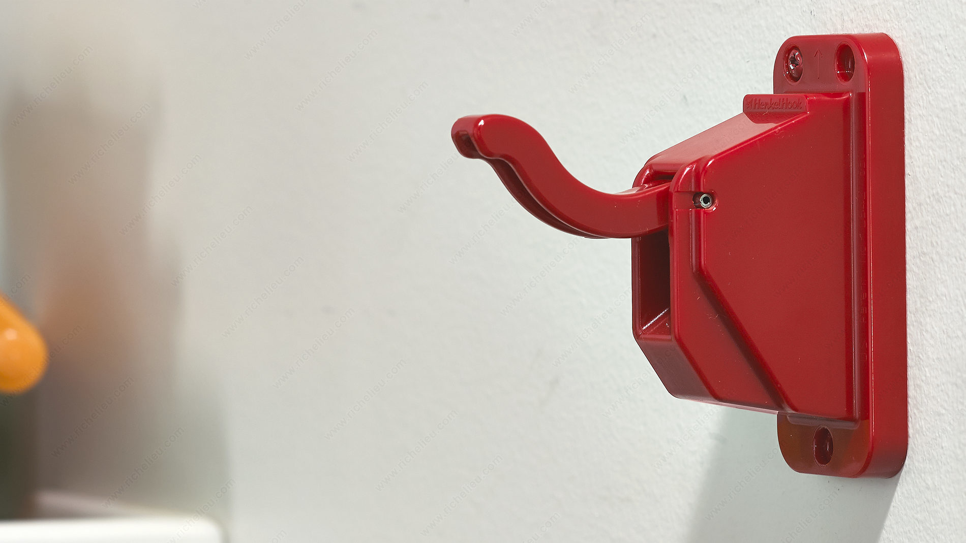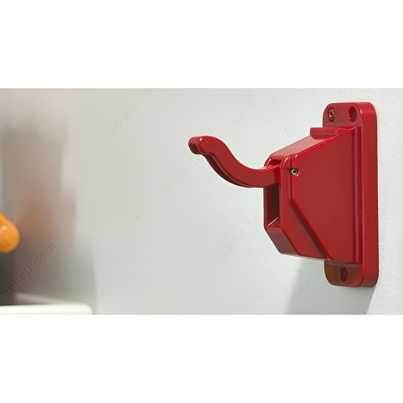 Richelieu HDP004IP Safety Hook - HD is a tamper-proof solution designed to enhance safety and convenience in various environments. This innovative hook automatically releases when the weight exceeds 26 lb, ensuring that items do not remain suspended if the capacity is surpassed. With a load capacity of 26.5 lb, it can securely hold coats, backpacks, purses, and more, making it a versatile choice for schools, daycares, fitness facilities, and residential spaces. Measuring 3 ¾ in in height and width, and projecting 3 ¾ in, this compact hook fits seamlessly into any setting while providing reliable functionality. Constructed from durable plastic, the hook is available in a vibrant red finish, adding a pop of color wherever it is installed. Designed specifically for children, the hook contributes to a safer environment by preventing potential hazards associated with overloaded hooks. Installation is straightforward, as screws are included for easy mounting. Whether used in long-term care centers, medical spaces, or recreational facilities, the Richelieu HDP004IP Safety Hook combines practicality with safety, making it an essential addition to any space requiring secure hanging solutions.