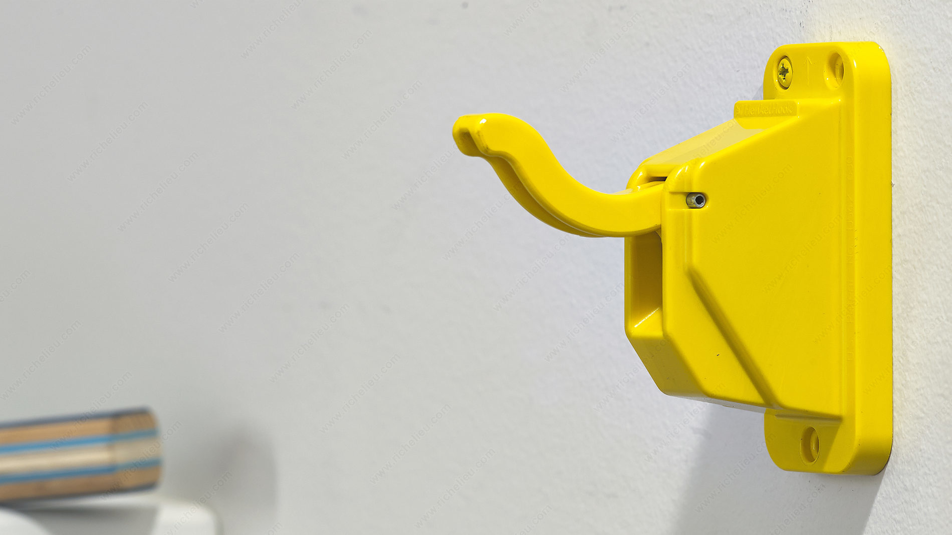 Richelieu HDP007IP Safety Hook - HD is a reliable and innovative solution for safely hanging coats, backpacks, purses, and other items in various environments. This tamper-proof hook is designed to release automatically when the weight exceeds 26 lb, ensuring that your belongings are secure until the load limit is reached. Once the weight is reduced, the hook automatically resets to its upright position, making it a practical choice for both safety and convenience. Constructed from durable plastic, the HDP007IP features a bright yellow finish that adds visibility, especially in settings designed for children, such as schools and daycares. With overall dimensions of 3 3/4 inches in height and projection, and a width of 1 5/8 inches, this hook is optimized for space efficiency while providing a robust load capacity of 26.5 lb. Ideal for diverse spaces including fitness facilities, medical centers, and recreational areas, this safety hook is not only functional but also enhances the organization of your environment. Each hook comes with included screws for easy installation, ensuring a hassle-free setup. Choose Richelieu HDP007IP for a safe and effective hanging solution that meets the demands of both residential and professional spaces.