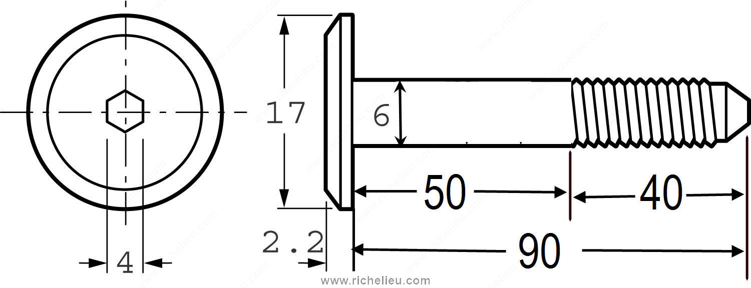 Richelieu JCBB0113C1 Assembly Bolt JCB-B is designed for efficient furniture assembly, delivering both reliability and style. Crafted from durable steel, this bolt features an oil-rubbed bronze finish that complements various designs while ensuring long-lasting performance. With a diameter of 1/4 inch and a length of 3 17/32 inches, it is perfectly sized for robust connections in furniture projects. The bolt includes a PowerHead (MC) for easy installation, utilizing a #4 hex key for secure fastening. Its coarse thread type with a pitch of 20 ensures a strong grip, making it ideal for applications where stability is essential. The blunt point design enhances ease of use, allowing for straightforward engagement without the risk of splitting materials. Each bolt is sold per unit, making it convenient for professionals and DIY enthusiasts alike, whether stocking up for a large project or completing a single task. Although not certified, this assembly bolt meets practical needs and provides a dependable solution for furniture assembly. Richelieu's commitment to quality means you can trust the JCBB0113C1 to deliver performance and aesthetic appeal in your builds.