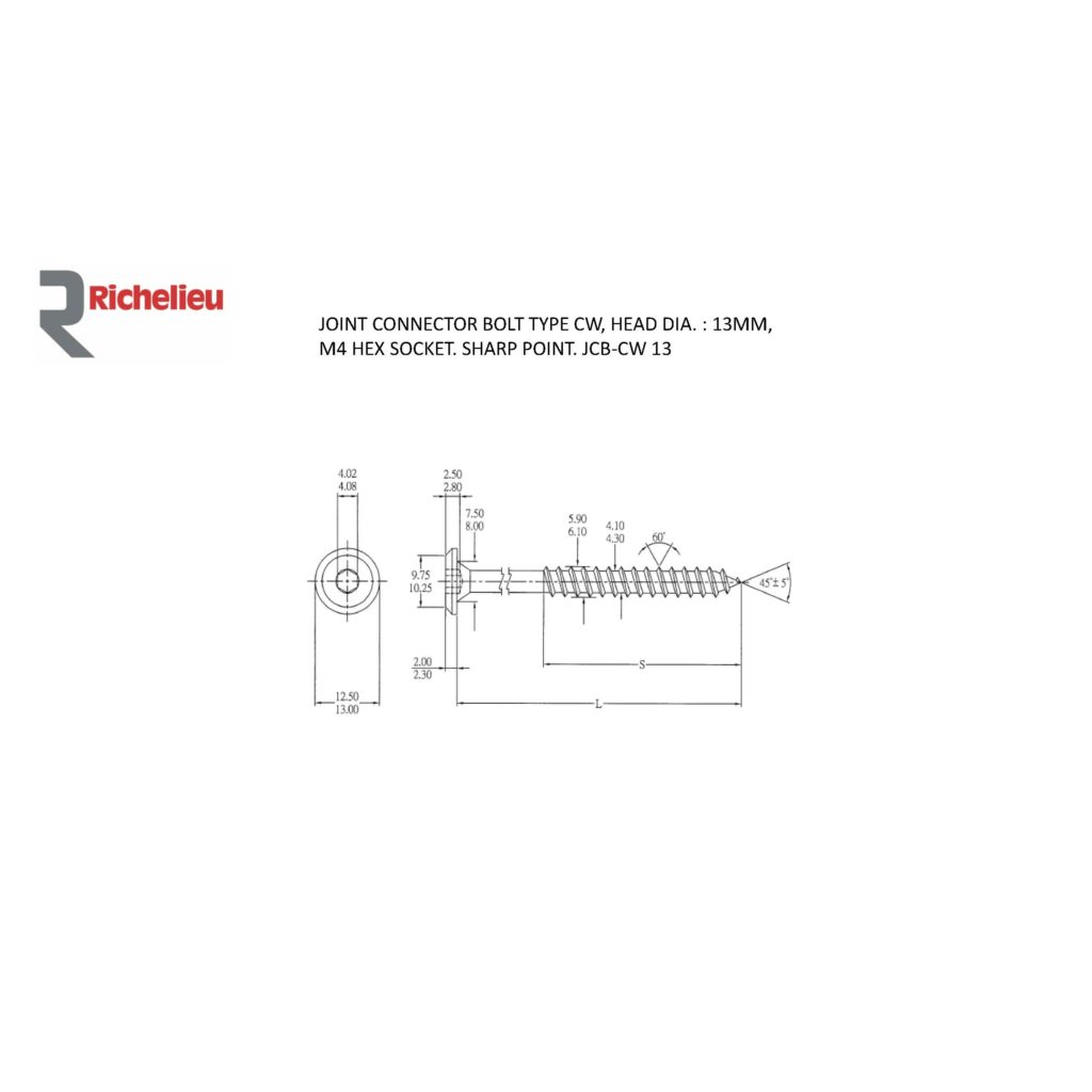 Richelieu JCBCW01034 JCB-CW Type Assembly Lag Bolt offers a reliable solution for your furniture assembly needs. Crafted from durable steel, this lag bolt ensures strong, long-lasting connections that stand up to the rigors of everyday use. The black oxide finish not only provides a sleek aesthetic but also enhances corrosion resistance, making it suitable for various environments. Designed specifically for wood applications, the JCBCW01034 features a PowerHead (MC) for easy driving and optimal torque. With a length of 1 31/32 inches, it is the perfect size for securely fastening components without compromising structural integrity. The bolt requires a #4 hexagonal key for installation and necessitates a 6 mm pre-drilling, ensuring a precise fit and simplifying the assembly process. Ideal for furniture assembly, this lag bolt is an essential component for builders and DIY enthusiasts alike. It ships conveniently via UPS, allowing for efficient delivery to your job site or home workshop. Choose Richelieu's JCBCW01034 JCB-CW Type Assembly Lag Bolt for a dependable fastening solution that combines functionality with a modern finish, enhancing both the durability and appearance of your projects.