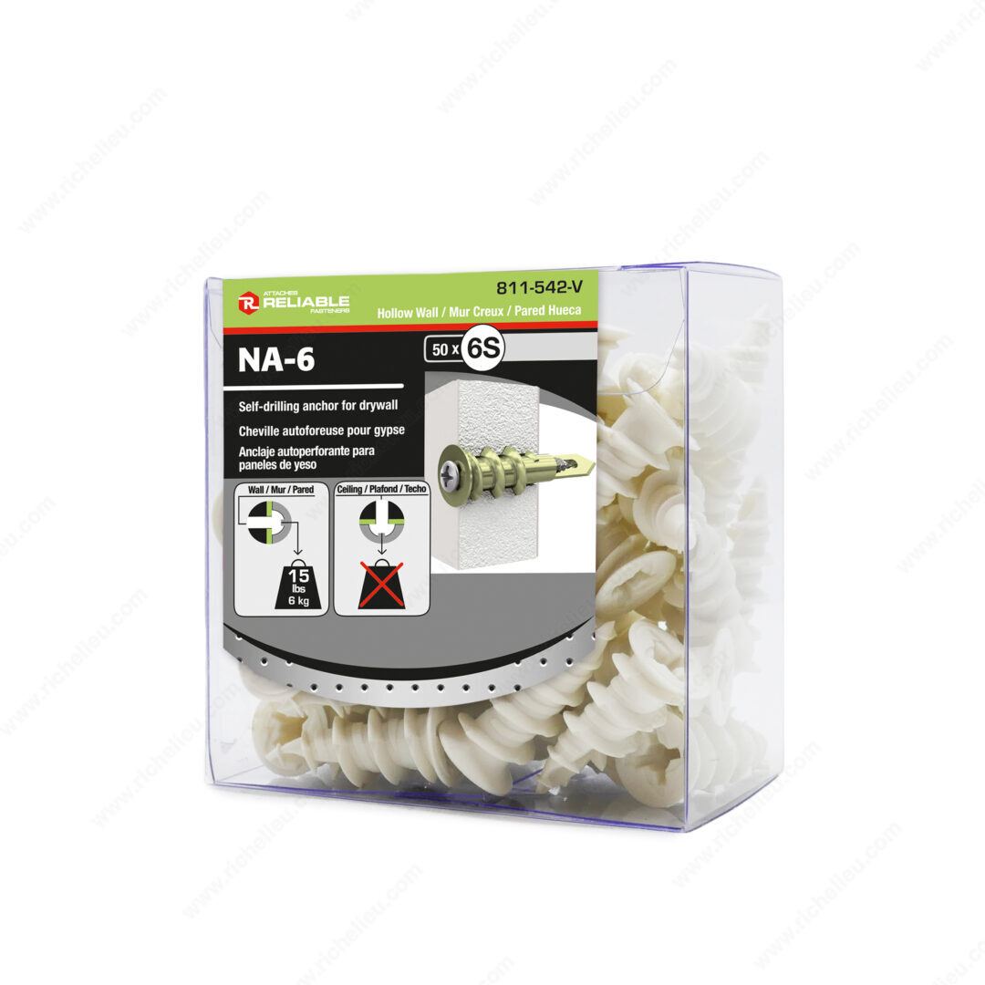 Richelieu NA6SVP Nylon Self-Drilling Anchor for Drywall offers unparalleled strength and stability for your wall-mounted projects. Designed specifically for drywall applications, this self-drilling anchor features a sharp edge that effortlessly cuts into the wall material, minimizing any risk of damage while reducing the force needed for installation. With its fine point, the anchor guides smoothly into the drywall, ensuring precise placement every time. Measuring 1 1/8 inches in length, the NA6SVP provides an impressive load capacity of 13.2 pounds, making it an ideal choice for various mounting needs. Packaged in a convenient box of 50, these anchors are perfect for both professionals and DIY enthusiasts looking to stock up on reliable hardware. While screws are not included, the anchor is compatible with #6 screws, offering flexibility for your specific project requirements. Installation is a breeze; no pre-drilling is necessary, allowing you to use a standard screwdriver for quick and efficient setup. Whether you’re hanging shelves, artwork, or light fixtures, the Richelieu NA6SVP ensures your installations are secure and dependable. Trust in Richelieu for high-quality hardware that meets the demands of any construction or renovation project.
