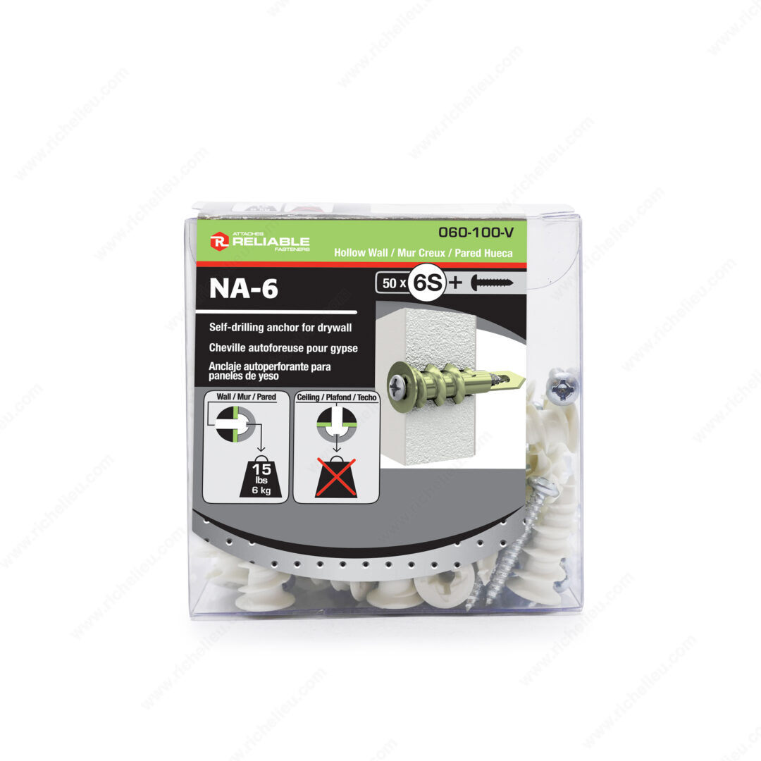 Richelieu NA6SVVA Nylon Self-Drilling Anchor for Drywall offers exceptional holding power and stability for your wall-mounted applications. Engineered for ease of use, this self-drilling anchor features a sharp edge that effortlessly penetrates drywall, minimizing the risk of damage while reducing the force needed for installation. Its fine point ensures precise guidance into the wall, allowing for a seamless and efficient installation process. Constructed from durable nylon, the NA6SVVA anchor is designed to support a load capacity of up to 13.2 lbs, making it ideal for a variety of light to medium-duty applications. Each package contains 50 anchors, providing ample supply for multiple projects or repairs. This anchor comes complete with #6 screws, ensuring you have everything needed for a secure fit. Compatible exclusively with drywall, the Richelieu NA6SVVA is perfect for hanging shelves, artwork, or other decorative items, delivering reliable performance you can trust. With no pre-drilling required, simply use a screwdriver to install, and enjoy the convenience and strength of this innovative fastening solution. Whether you’re a building professional or a knowledgeable homeowner, this product is a must-have in your toolkit.