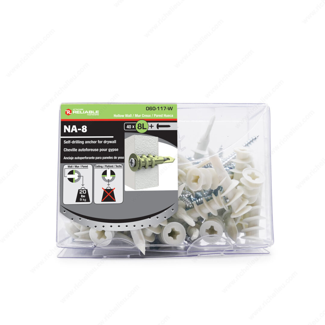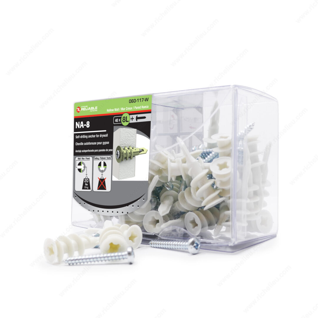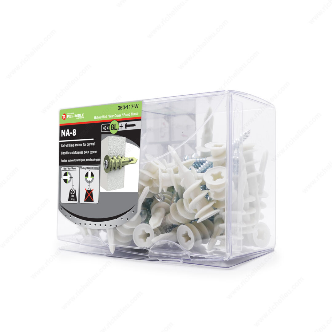 Richelieu NA8LVVA Nylon Self-Drilling Anchor for Drywall offers exceptional performance for your wall mounting needs. Engineered for maximum holding power, this self-drilling anchor features a sharp edge that effortlessly cuts into drywall, minimizing the risk of damage during installation. The design reduces the force required to screw it in, allowing for a quick and efficient setup with just a screwdriver-no pre-drilling necessary. With a length of 1 5/8 inches, the NA8LVVA can support a load capacity of up to 13.2 pounds, making it ideal for various wall-mounted applications. The fine point of the anchor guides it into the wall with precision, ensuring a secure fit every time. Manufactured from durable nylon, this anchor is built to withstand the rigors of everyday use. Each box contains 40 anchors, complete with #8 screws for your convenience. Whether you're a building professional or a knowledgeable homeowner, the Richelieu NA8LVVA is a reliable solution for all your drywall anchoring needs. Trust in its quality and performance for your next project, knowing it ships conveniently via UPS for easy access.