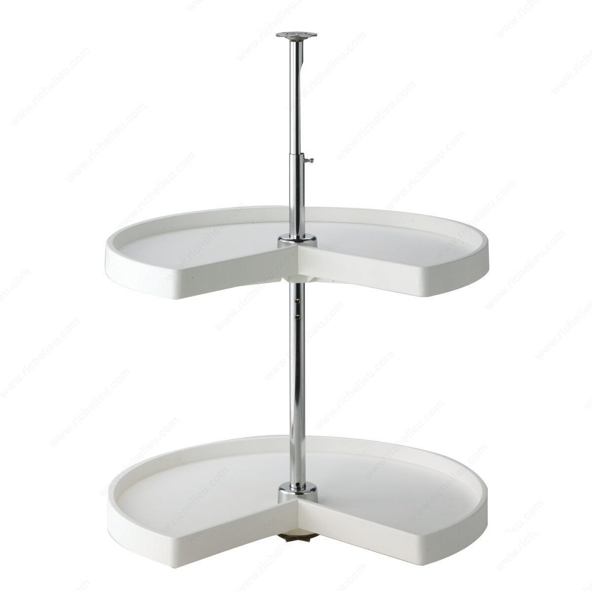 Richelieu PKN18ST30 Kidney Polymer Tray Set offers a practical and economical solution for your storage needs. Designed specifically for corner cabinets, this set includes two durable polymer trays that pivot smoothly, maximizing accessibility to your kitchen essentials. The trays feature a sleek white finish and a textured surface, ensuring items remain secure while in use. Each tray boasts a generous diameter of 18 inches and can support a maximum capacity of 23 lbs, making them ideal for food storage and preparation tasks. The extra-deep 1-inch rim height provides added security against spills and accidents, while the design seamlessly blends functionality with style. For optimal installation, these trays require an interior height of 25 1/2 to 31 1/2 inches. The lightweight polymer material not only makes them easy to handle but also contributes to their resistance to wear and tear, ensuring long-lasting performance. Shipping is convenient with the option to send via UPS. Upgrade your kitchen organization with the Richelieu PKN18ST30 Kidney Polymer Tray Set, making it easier to keep your ingredients and utensils within reach while maximizing your cabinet space.