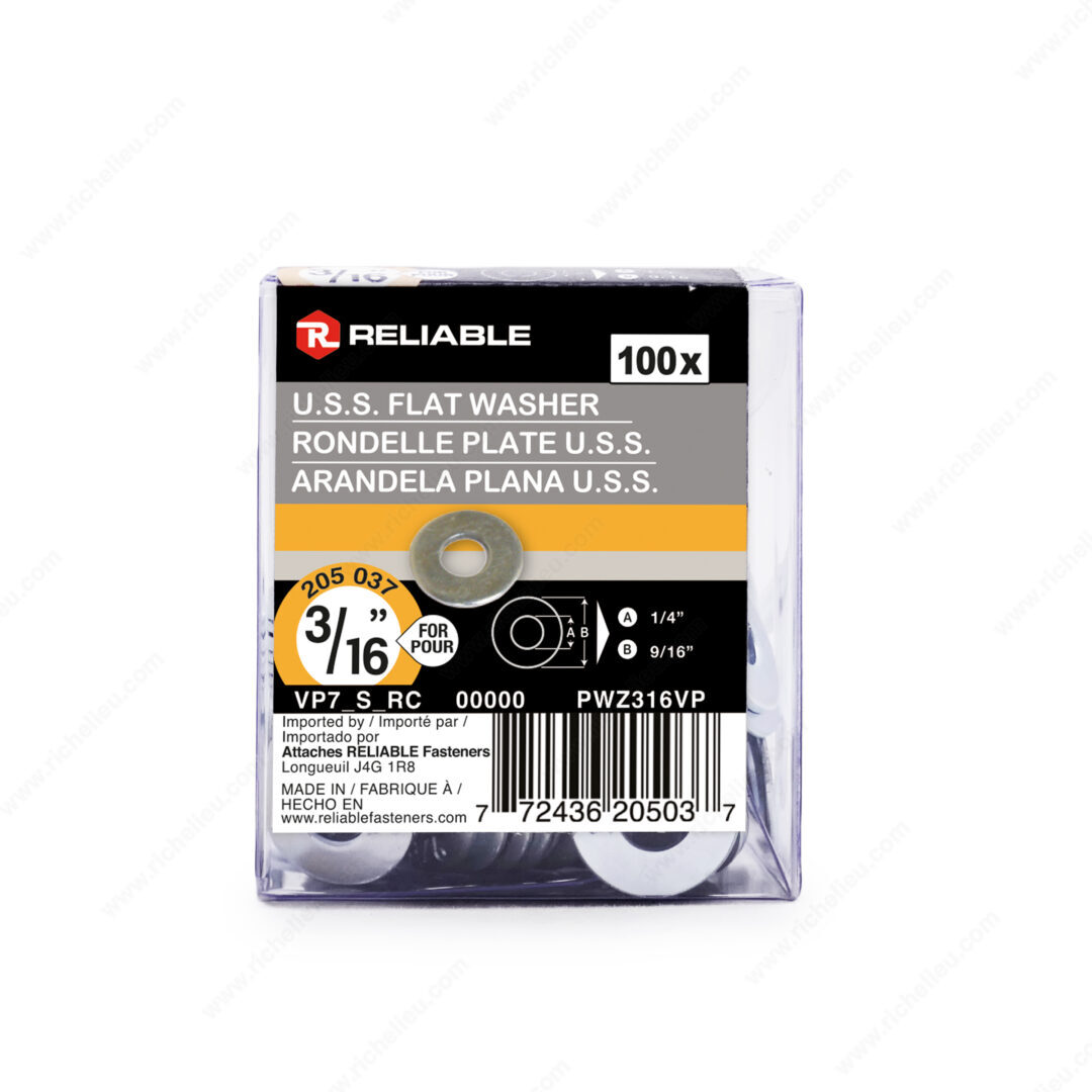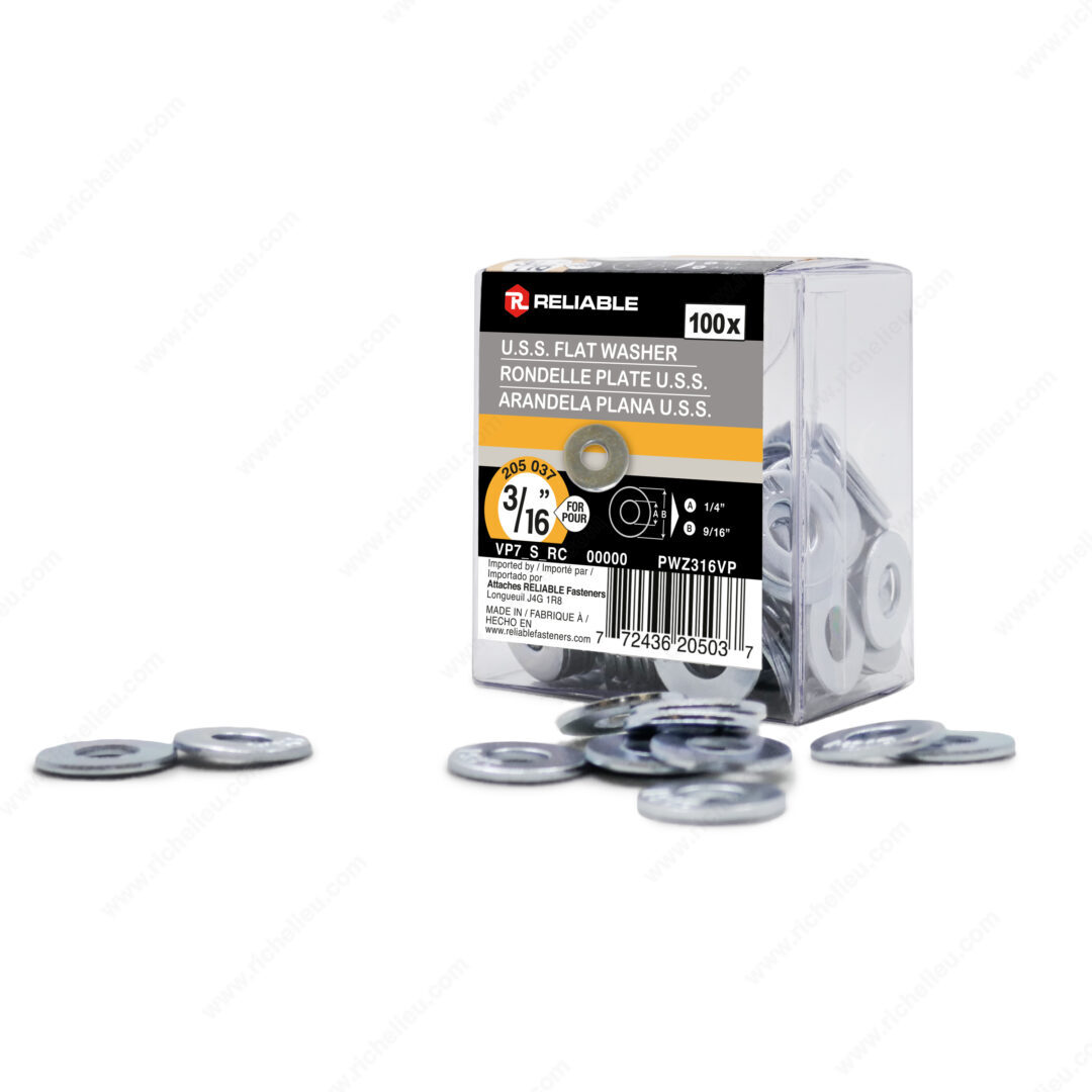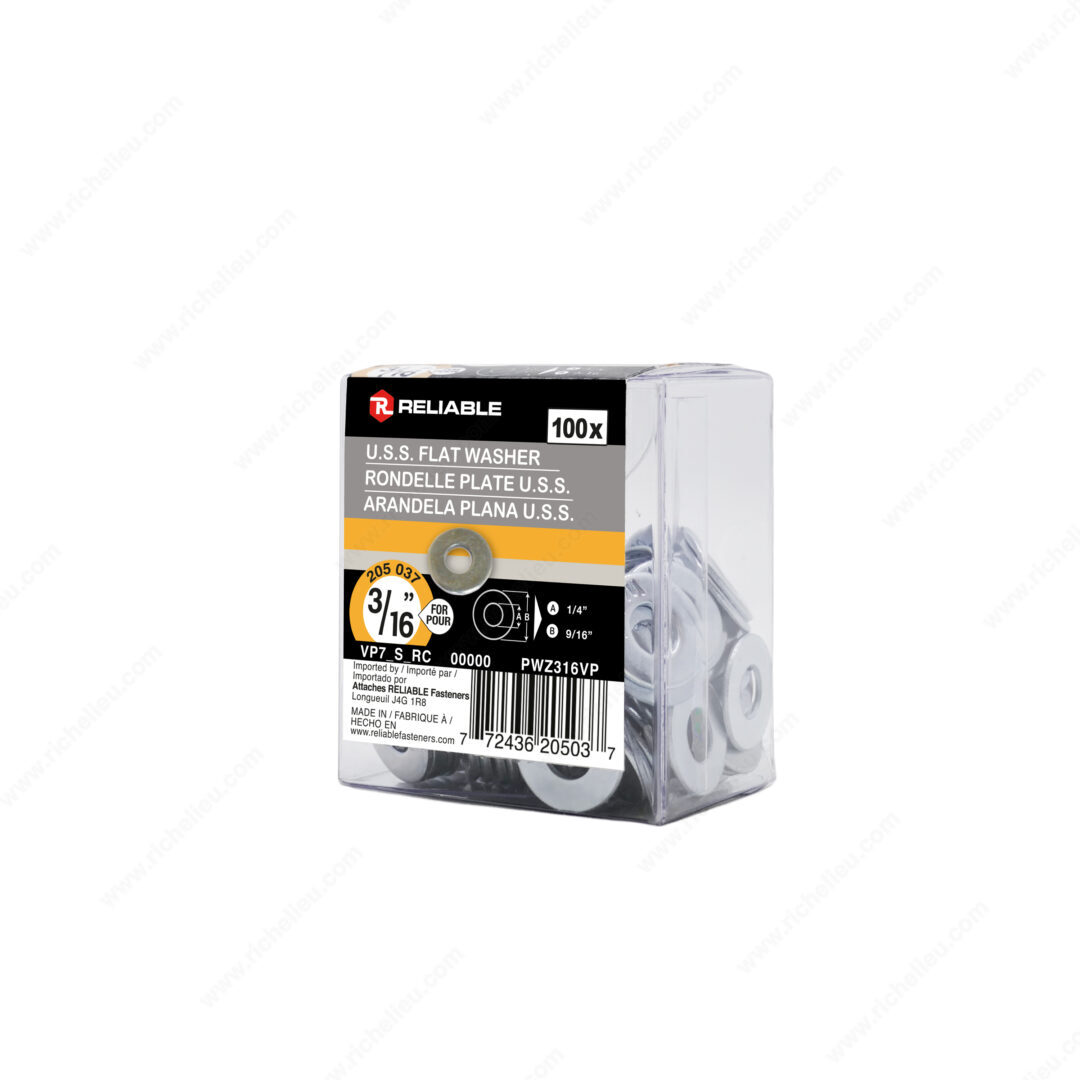 Richelieu PWZ316VP Flat Washer (USS) - Zinc offers an essential solution for enhancing the integrity of your fastening applications. Crafted from durable zinc-plated steel, this flat washer is designed to provide a greater bearing surface under fasteners, effectively preventing screws, bolts, or nuts from pulling through materials. This increased support is vital in ensuring the longevity and stability of your projects. With a bolt diameter of 3/16 inches and an inside diameter of 1/4 inch, these washers accommodate a variety of fastening needs. The outside diameter of 9/16 inches, along with a thickness ranging from 1/32 to 1/16 inches, makes them versatile for numerous applications. Each box contains 100 washers, ensuring you have an ample supply for both small and large projects. The zinc finish adds a layer of corrosion resistance, making these washers suitable for both indoor and outdoor use. Whether you are a building professional or a knowledgeable homeowner, the Richelieu PWZ316VP Flat Washer is an indispensable component in achieving a secure and durable fastening solution. Ship via UPS for convenience, ensuring that you have the quality materials you need, right when you need them.