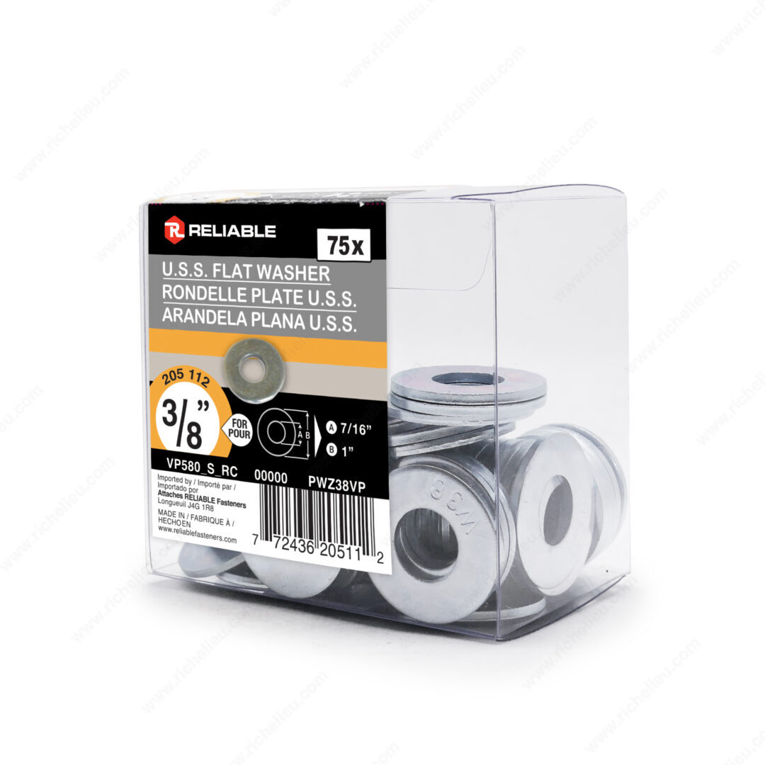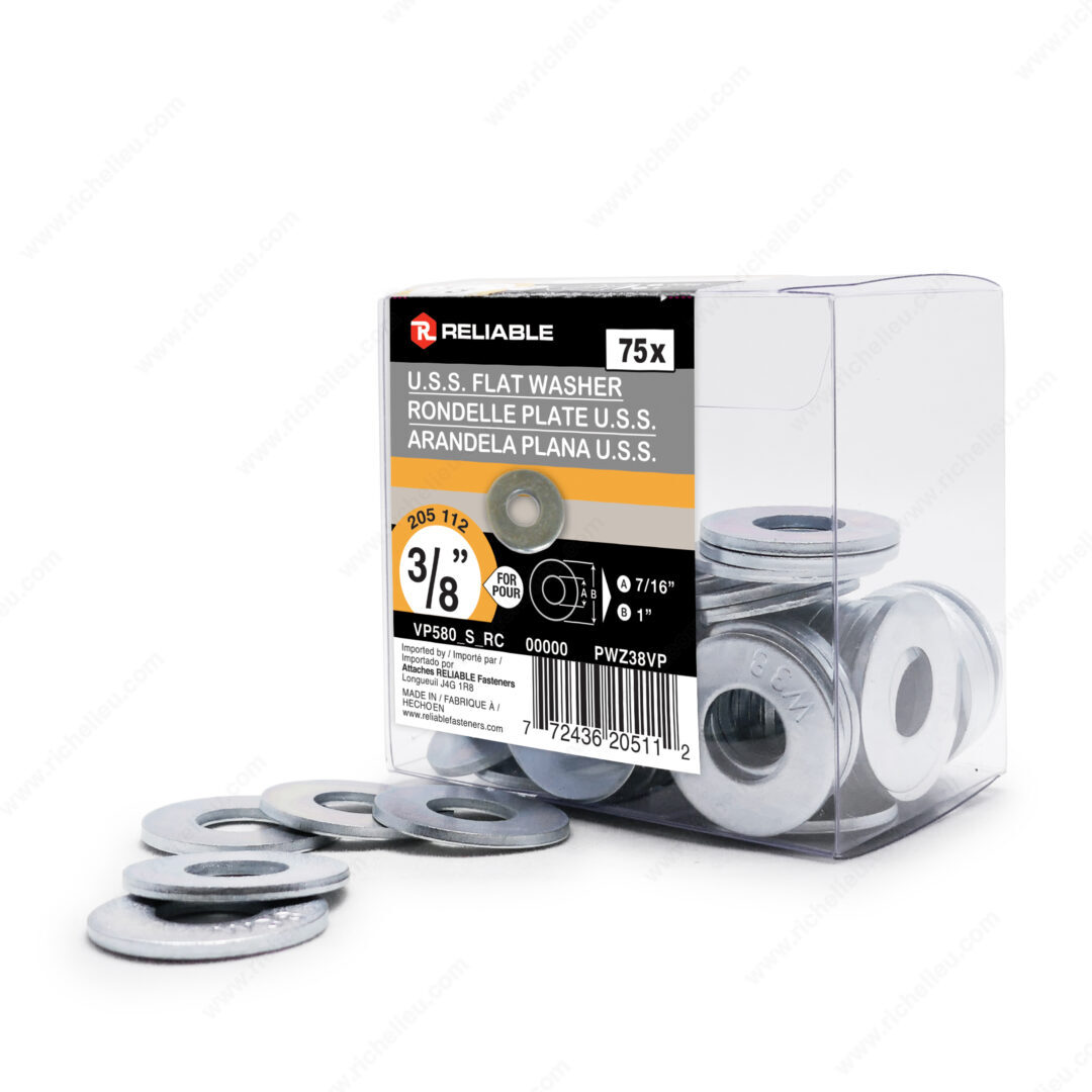 Richelieu PWZ38VP Flat Washer (USS) - Zinc offers a robust solution for any fastening project, thanks to its durable zinc-plated steel construction. Designed to provide a greater bearing surface, this flat washer effectively prevents screws, bolts, or nuts from pulling through the material, ensuring stability and reliability in your applications. With an outside diameter of 1 inch and an inside diameter of 7/16 inch, the washer accommodates a bolt diameter of 3/8 inch, making it versatile for various projects. Its thickness ranges from 1/16 to 7/64 inch, providing the right level of support without compromising the integrity of the materials being fastened. Packaged in a convenient box of 75, these washers are ideal for professionals who require quality and quantity in their hardware supplies. The zinc finish not only adds a layer of corrosion resistance but also enhances the overall aesthetic of your assembly. Richelieu's commitment to excellence is evident in this flat washer, making it a trusted choice for builders, contractors, and knowledgeable homeowners alike. Available for UPS shipping, the PWZ38VP flat washer ensures that you have the right tools to get the job done efficiently and effectively.