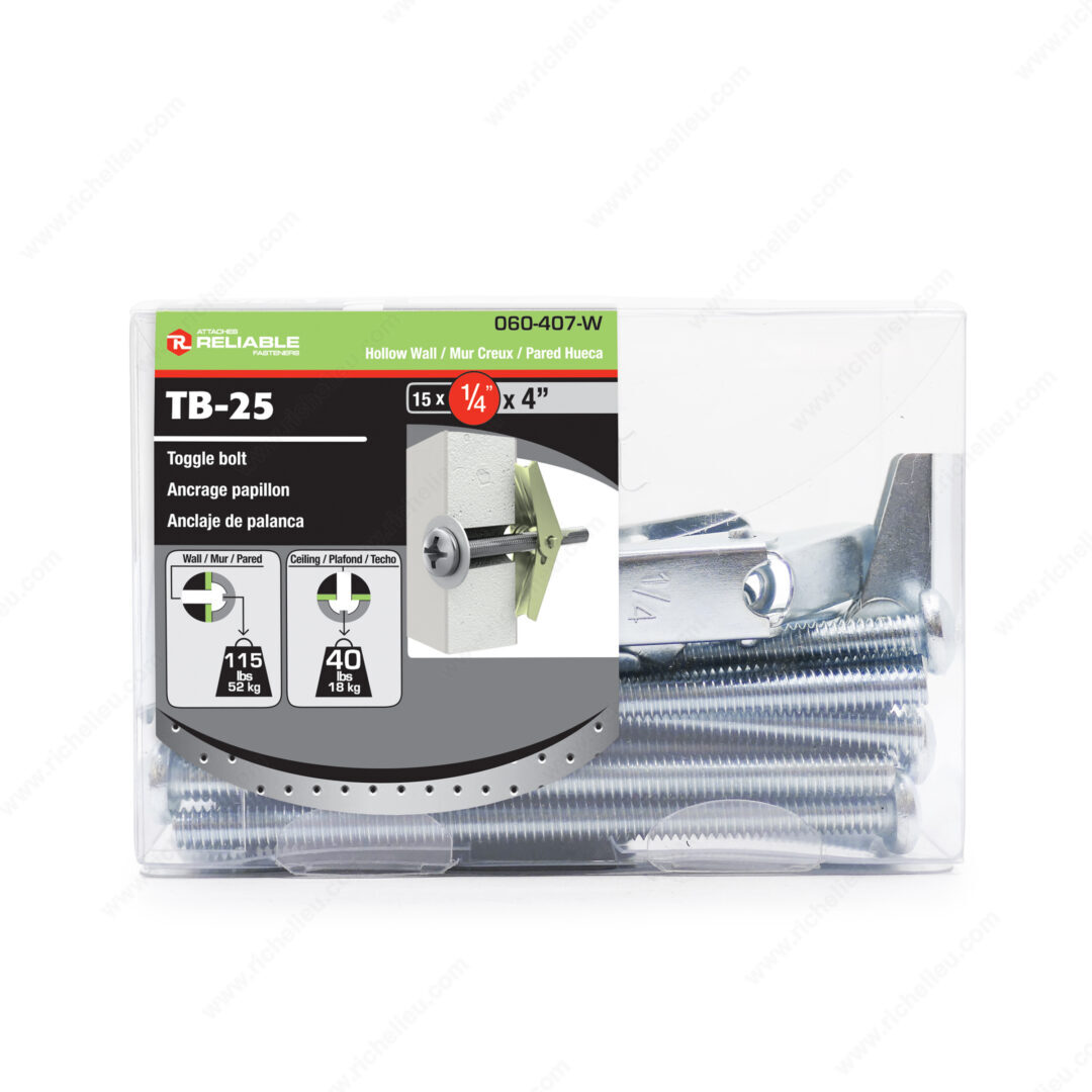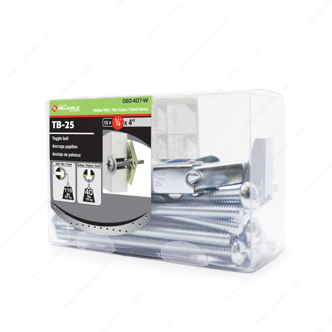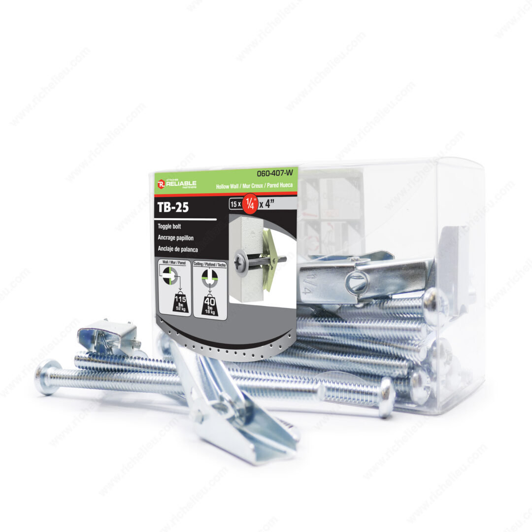Richelieu STZ144VVA Toggle Bolt offers a robust solution for securing fixtures to hollow materials such as drywall, tile, and plaster. Designed for versatility, these metal spring toggle bolts are ideal for both ceiling and wall applications, ensuring reliable support for various projects. Each toggle bolt comes with a 1/4 inch diameter and a substantial length of 4 inches, making them suitable for a wide range of installations. With a load capacity of up to 115 lbs when wall-mounted on drywall and 39.7 lbs for ceiling-mounted applications, these toggle bolts provide the strength needed for heavy-duty tasks. The zinc finish not only enhances durability but also helps resist corrosion, ensuring longevity even in challenging environments. Packaged in a convenient box of 15, the Richelieu STZ144VVA Toggle Bolts are ready to meet your construction and renovation needs. Easy to install and compatible with various hollow materials, these toggle bolts are a must-have for professionals and knowledgeable homeowners alike. Whether you're hanging shelves, fixtures, or decorative elements, trust Richelieu to deliver quality and performance that stand the test of time.
