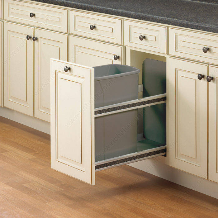 Richelieu USC12135PT Undermount Recycling Center offers an efficient and stylish solution for managing waste and recycling in your kitchen. Designed with full-extension slides, this center allows for easy access to the 35-quart bin, making disposal effortless. Installation is a breeze, thanks to self-aligning brackets that secure with only four screws, allowing you to set it up in minutes. The unique, washable solid backsplash and floor are standout features that prevent debris from falling through to the floor or cabinet below, simplifying cleaning and enhancing hygiene. This thoughtful design also conceals hardware, maintaining a sleek appearance. The decorative rail accents can be customized to complement your countertops or cabinetry, adding a touch of personal style to your space. Constructed from durable plastic, the USC12135PT supports a load rating of up to 80 lbs, ensuring it can handle everyday kitchen waste without issue. Its dimensions of 22 7/16 inches in depth, 19 3/16 inches in height, and 11 13/16 inches in width make it a practical fit for various cabinetry configurations. With its soft-motion system, this undermount recycling center combines functionality with modern elegance, making it a must-have for any organized kitchen.