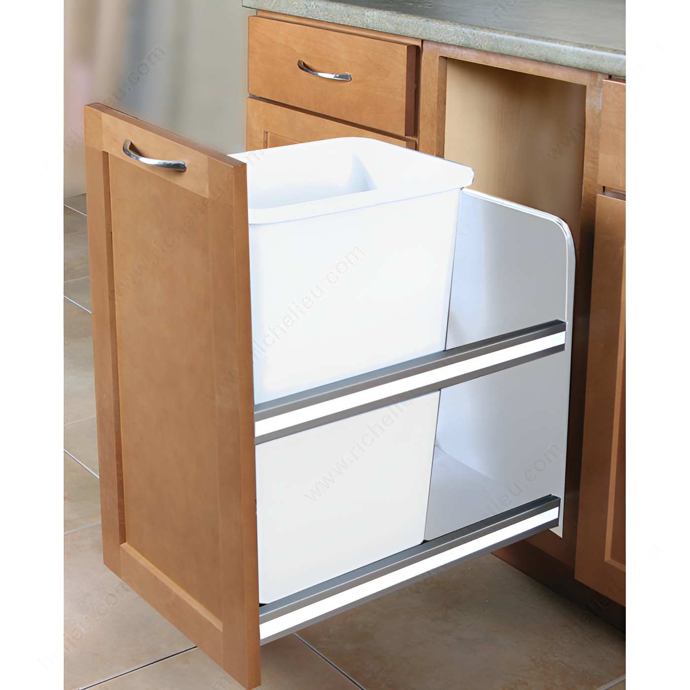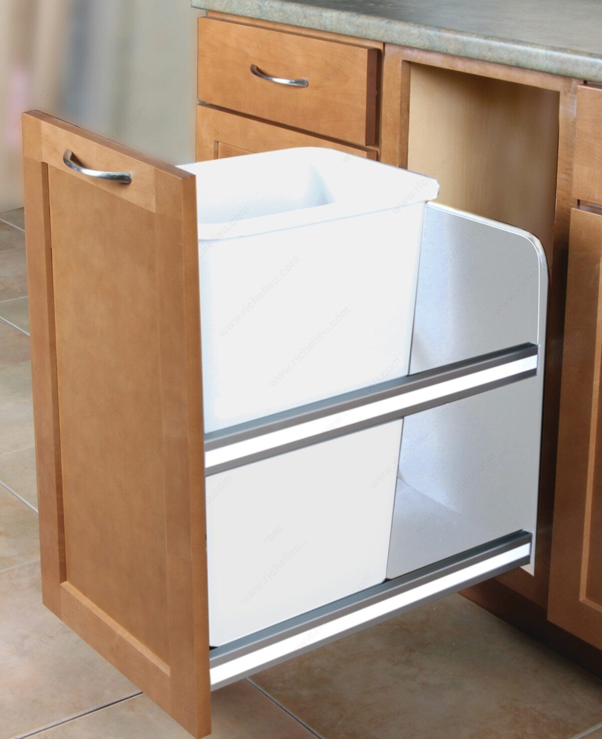 Richelieu USC12150WH Undermount Recycling Center combines functionality with sleek design, making it an essential addition to your kitchen. This undermount unit features full-extension slides that allow for easy access to your waste and recycling materials. Installation is a breeze, requiring only four screws thanks to the self-aligning brackets, which ensures a secure fit in minutes. Designed with cleanliness in mind, the unique washable solid backsplash and floor prevent debris from falling through to your floor or cabinet, allowing for effortless cleaning and maintaining a tidy appearance. The decorative rail accents are customizable, letting you match the unit to your countertops or cabinetry for a cohesive look. With a generous bin capacity of 50 quarts, this recycling center is perfect for managing waste efficiently. It is constructed from durable plastic, boasting a load rating of 80 lb, ensuring it can handle your daily needs. The dimensions of 22 7/16 in depth, 23 1/4 in height, and 11 13/16 in width provide a compact solution for any kitchen space. The soft-motion system enhances usability, making this unit a smart choice for both cleaning and preparation areas. Choose Richelieu for a stylish and practical recycling solution.