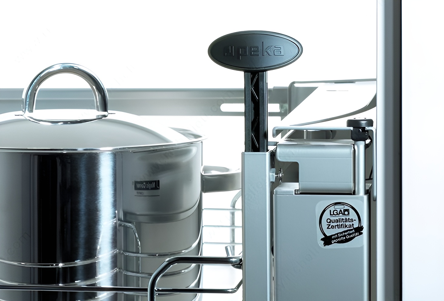 Richelieu WEBKIT1002501 Magic Corner II Set, Minimum Opening 444mm (17-1/2")Richelieu WEBKIT1002501 Magic Corner II Set for a Minimum Opening of 444 mm (17-1/2") revolutionizes corner cabinet storage with its innovative design. This mechanism is specifically engineered to maximize the available space in cabinets with hinged doors, ensuring that every inch is utilized efficiently. The state-of-the-art sliding technology guarantees that all components glide silently and effortlessly, even under the weight of full baskets. Manually operated, this system features front baskets that pull out and swivel, allowing for easy viewing and access to all stored items. The rear baskets slide out seamlessly, further enhancing accessibility. Depending on your configuration, the Magic Corner II can utilize over 80% of your storage area, making it an invaluable addition to any kitchen. Constructed from durable steel and finished in a stylish maple/chrome combination, this set is as aesthetically pleasing as it is functional. It supports a capacity of up to 10 kg (22 lb) for front baskets and 8 kg (18 lb) for rear baskets. The ergonomic handle can be adjusted in height for user convenience, while laterally mounted deflection clips protect your cabinet doors from damage. An anti-slip covering on the baskets keeps stored items safely in place, offering peace of mind during use.