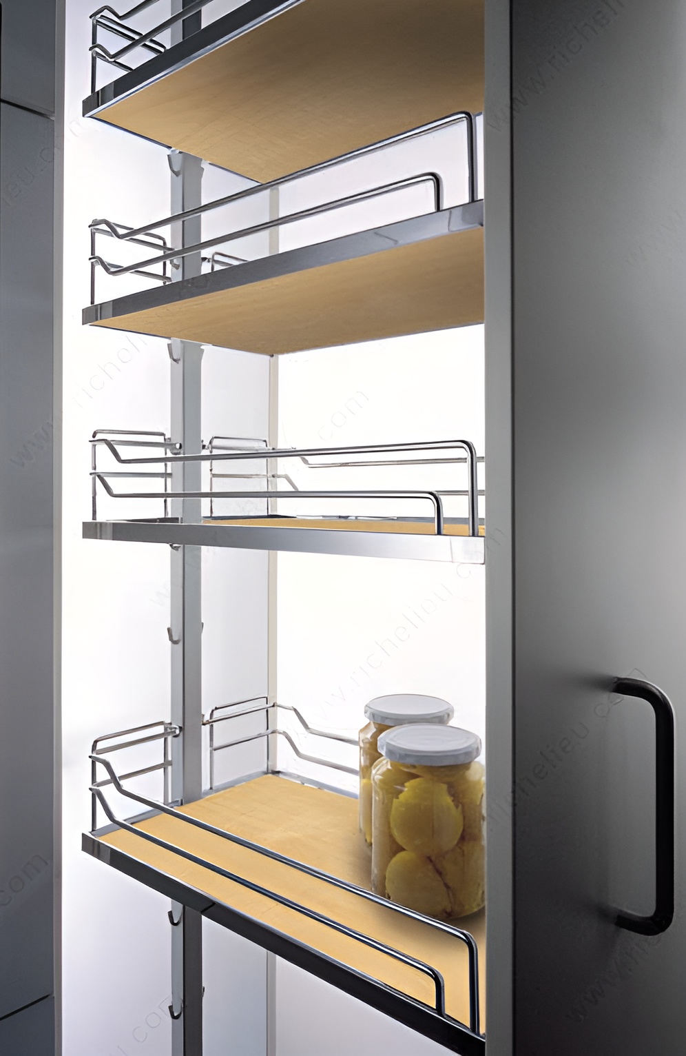 Richelieu WEBKIT1004099 Dispensa Kit with Maple and Chrome Arena Baskets is the ideal solution for maximizing pantry storage. This sliding basket kit is designed specifically for pantry units, allowing for full outward extension to provide easy access to your food items. The combination of maple and chrome finishes not only enhances the aesthetic appeal of your kitchen but also ensures durability and longevity. To achieve optimal functionality, the kit requires interior dimensions of a minimum depth of 19 5/8 inches, a height ranging from 63 to 78 3/4 inches, and a minimum width of 16 1/4 inches. With a robust load rating of up to 220 pounds, this system is perfect for storing a variety of pantry essentials, from canned goods to bulk items. The WEBKIT1004099 is designed for use in wall unit and pantry cabinets, making it a versatile choice for any kitchen. It ships conveniently via UPS, providing a hassle-free purchasing experience. Elevate your kitchen organization with this stylish and practical pantry solution, ensuring everything is neatly stored and easily accessible whenever you need it.
