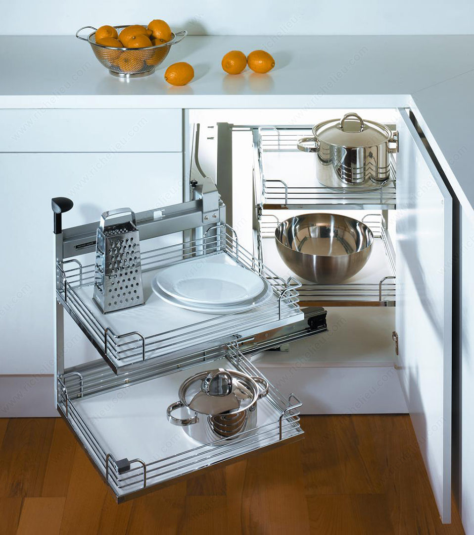 Richelieu WEBKIT1008346 Magic Corner II Set for a Minimum Opening of 394 mm (15-1/2") is expertly designed to optimize the often-underutilized space in corner cabinets equipped with hinged doors. This innovative system employs advanced sliding technology, allowing all components to glide silently and effortlessly, even when fully loaded. Manual operation ensures a straightforward user experience, while front baskets pull out and swivel for seamless access to the entire storage area. The rear baskets are crafted to slide out, providing easy visibility and retrieval of all stored items. Depending on your configuration, this versatile system can help you utilize over 80% of the available storage space, making it a practical choice for any kitchen. The ergonomic handle is adjustable in height, ensuring comfort for all users. To protect your cabinet doors, laterally mounted deflection clips are included, preventing any potential damage during operation. Additionally, the baskets feature an anti-slip covering, ensuring that your items remain securely in place even as the system is in motion. With a stylish gray and chrome finish, this Magic Corner II set requires a minimum interior depth of 19 5/8 inches, a height of 21 1/8 inches, and a width of 33 7/8 to 38 1/4 inches, making it a perfect fit for your cabinetry needs.