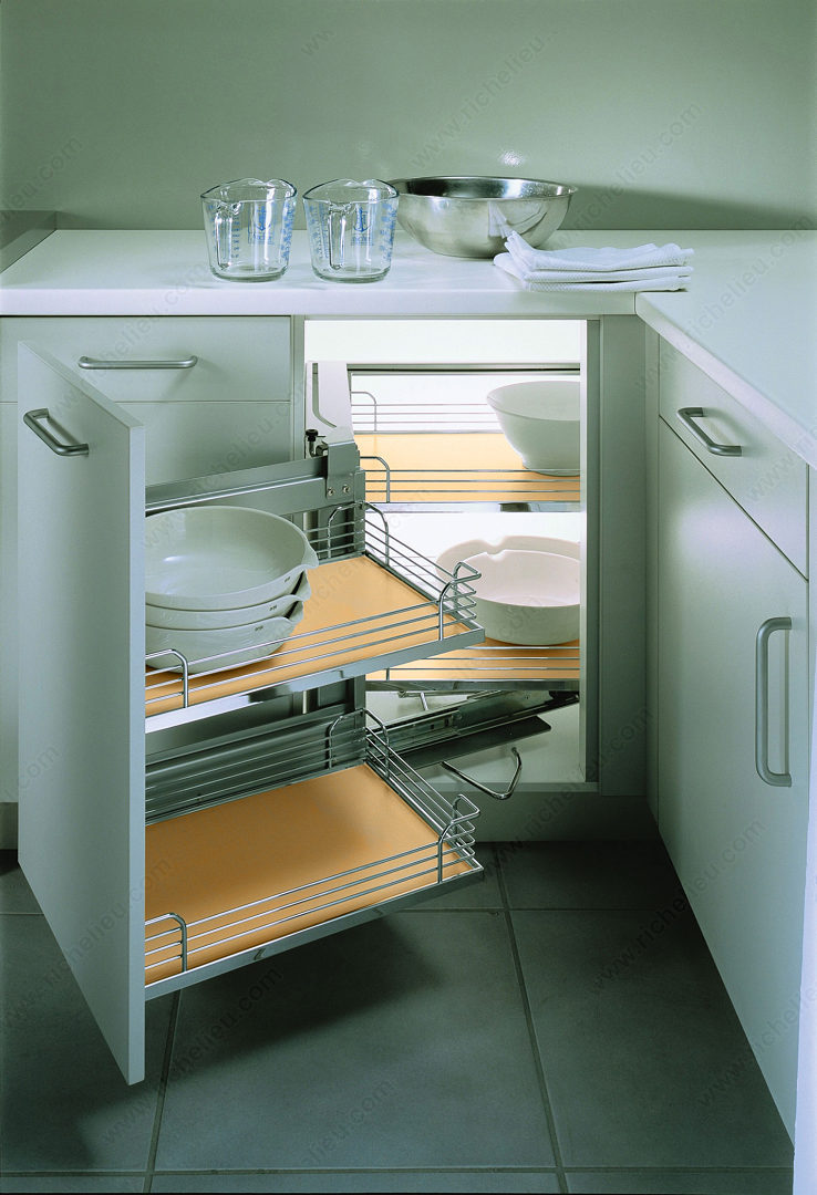 Richelieu WEBKIT1008353 Magic Corner Set with Maple Arena Baskets offers an innovative solution for optimizing corner cabinet space. This four-basket storage system is designed to enhance accessibility and organization in your kitchen. When the cabinet door is opened, the two rear baskets slide laterally, bringing them into view, while the front baskets, attached to the door, glide smoothly outside of the cabinet. This design ensures that you have full and ergonomic access to all your stored items, making it easy to retrieve and store kitchen essentials. Each front basket is capable of holding up to 15 lb (7 kg), while the more spacious rear baskets can accommodate up to 20 lb (9 kg), allowing you to store a variety of items securely. The Magic Corner Set is finished in a stylish maple and chrome combination, adding a modern touch to your kitchen decor. To install this versatile storage solution, ensure that your cabinet meets the required interior dimensions: a minimum depth of 19 5/8 inches, height of 21 1/4 inches, and width ranging from 33 7/8 to 38 1/4 inches. Designed specifically for corner cabinets, the Magic Corner Set is an essential addition for those seeking efficient food storage and preparation solutions.