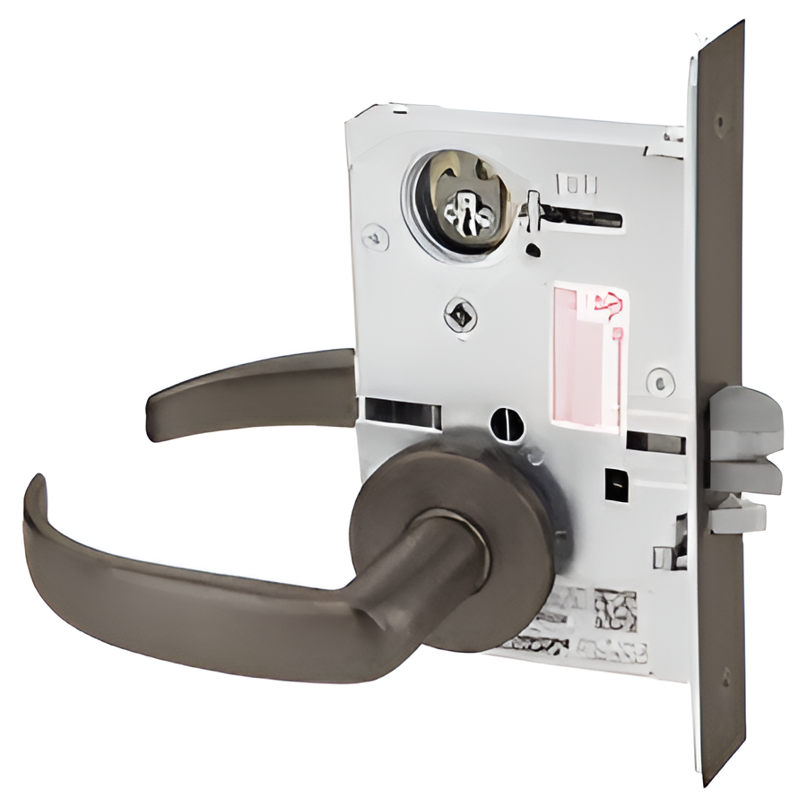 Corbin Russwin ML2002 PSA 613E LC V20 V01 Princeton Lever Mortise Lock Kit with Indicators and ANSI Strike, Oil Rubbed BronzeCorbin Russwin ML2002 PSA 613E LC V20 V01 KIT is a robust classroom intruder mortise lock designed for high-traffic environments. Featuring the elegant Princeton lever with A Rose trim, this lock combines functionality with aesthetic appeal. It includes two 1-1/8 mortise cylinders and a dual visual indicator system, providing clear status updates with green/red lights for both locked/unlocked and vacant/occupied conditions. Built to exceed ANSI/BHMA Grade 1 standards, the ML2002 boasts direct drive performance, ensuring consistent torque during operation. Its innovative torsion spring design contributes to smooth lever rotation, while the field-reversible latchbolt allows for easy re-handing without disassembly. The lock is compatible with a variety of cylinder formats, including conventional and large formats, making it versatile for various applications. The durable construction of heavy-gauge steel ensures longevity and reliability, withstanding attempts of abuse and intrusion. An EcoFlex®️ technology integration offers significant energy savings for electromechanical functions. This lock is available in a dark oxidized satin bronze finish (613E), providing a sophisticated look that complements any door type, including wood and hollow metal. Enjoy peace of mind with a ten-year limited warranty, solidifying the ML2002's position as a trusted security solution.