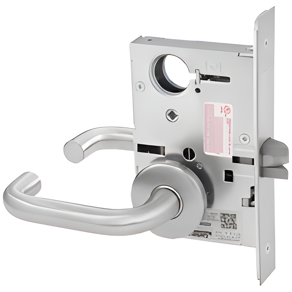 Corbin Russwin ML2003 LWA 626 LC V10-EMA-LH V01 KIT is a robust classroom mortise lock designed for high-traffic environments where security and reliability are paramount. This ANSI/BHMA Grade 1 lock features a Lustra lever with an A rose trim, providing an elegant yet durable interface. The lock is equipped with a less 1-1/8 mortise cylinder and includes dual visual indicators-an outside indicator engraved with locked/unlocked status (green/red) and an inside indicator that mirrors this functionality. Engineered from heavy-gauge steel, the ML2000 series ensures resistance against tampering and abuse. Its innovative design incorporates a direct drive performance system, resulting in smooth lever operation and a firm return to eliminate sag. The lock is adaptable, with a field-reversible latchbolt for easy installation on left-handed doors. With the ability to integrate with Corbin Russwin’s patented key systems and access control platforms, this lock is not only flexible but also eco-conscious, utilizing EcoFlex® technology for significant energy savings. Available in a range of finishes, including Satin Chrome (626), the Corbin Russwin ML2003 is backed by a ten-year warranty, ensuring long-lasting performance and peace of mind for any commercial application.