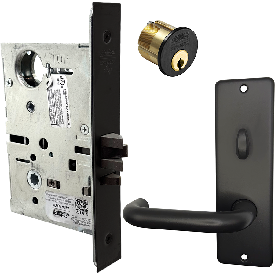 KIT - Entry or Office Mortise Lock, Lustra Lever with M Escutcheon Trim, Standard 1-1/8 Mortise Cylinder, A02 Yale Style Standard Cam, L4 Keyway 0-Bit, Handing is Field Reversible, ANSI Strike SS118, 622/US19/BSP Black Suede Powder Coat