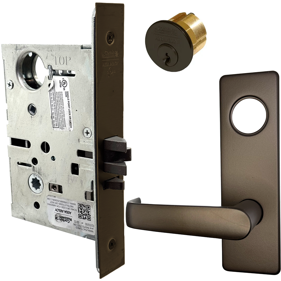 KIT - Classroom Mortise Lock, Newport Lever with M Escutcheon Trim, Standard 1-1/8 Mortise Cylinder, A02 Yale Style Standard Cam, L4 Keyway 0-Bit, Handing is Field Reversible, ANSI Strike SS118, 613E/US10BE Oil Rubbed Bronze