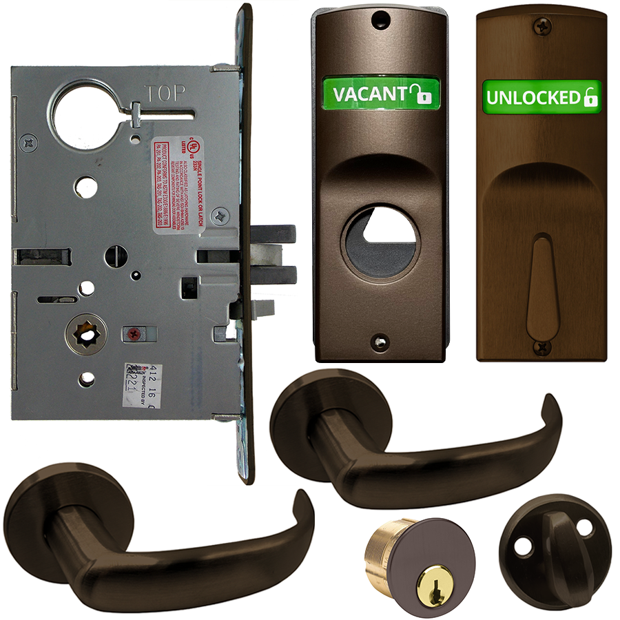 KIT - Apartment Mortise Lock with Deadbolt Toggle, Princeton Lever with A Rose Trim, Standard 1-1/8 Mortise Cylinder, A01 Clover Cam, L4 Keyway 0-Bit, V20 Outside Indicator (Vacant/Occupied, Green/Red), V01 Inside Indicator (Locked/Unlocked, Green/Red), ANSI Strike SS118, 613E/US10BE Oil Rubbed Bronze