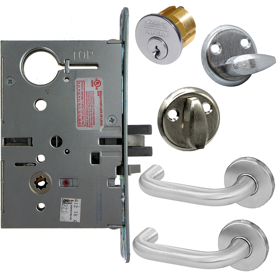 KIT - Electrified Mortise, Field Reversible - Fail Safe and Fail Secure, Lustra Lever with A Rose Trim, Standard 1-1/8 Mortise Cylinder, A01 Clover Cam, L4 Keyway 0-Bit, Handing is Field Reversible, ANSI Strike SS118, 626/US26D Satin Chrome