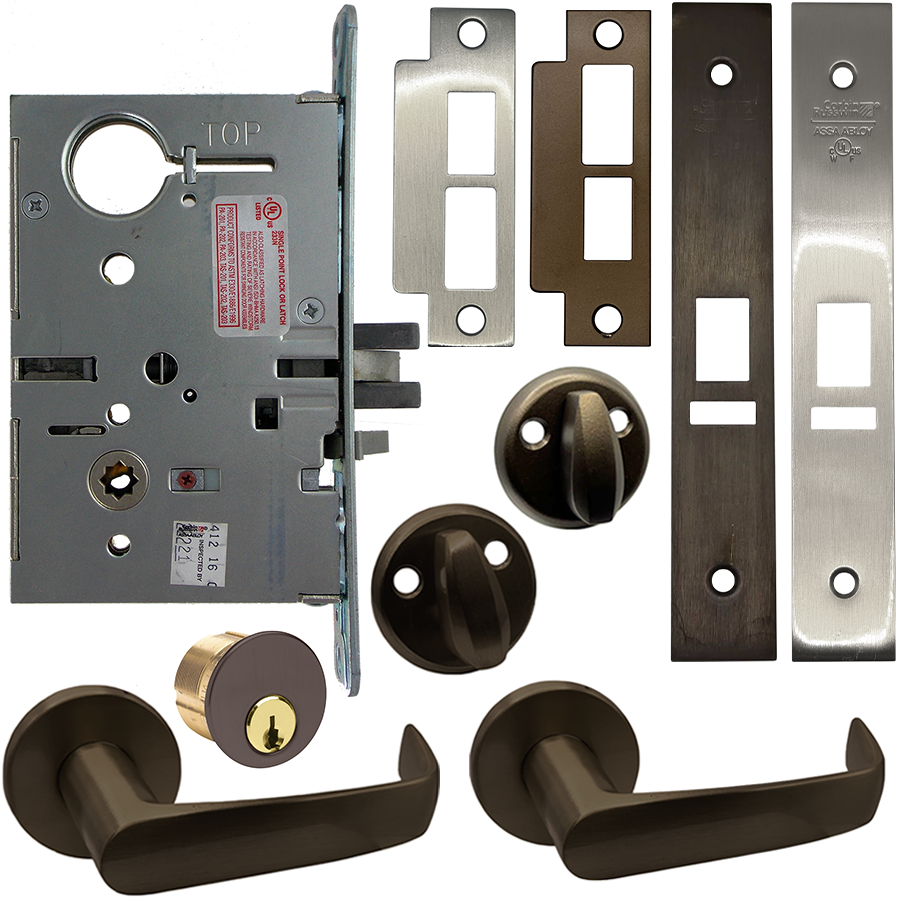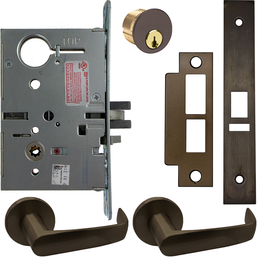 KIT - Electrified Mortise, Field Reversible - Fail Safe and Fail Secure, with (REX) Request to Exit Switch, Newport Lever with A Rose Trim, Standard 1-1/8 Mortise Cylinder, A01 Clover Cam, L4 Keyway 0-Bit, Handing is Field Reversible, ANSI Strike SS118, 613E/US10BE Oil Rubbed Bronze