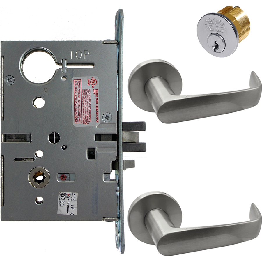 KIT - Electrified Mortise, Field Reversible - Fail Safe and Fail Secure, with REX Request to Exit Switch, Newport Lever with A Rose Trim, Standard 1-1/8 Mortise Cylinder, A01 Clover Cam, L4 Keyway 0-Bit, Handing is Field Reversible, ANSI Strike SS118, 626/US26D Satin Chrome