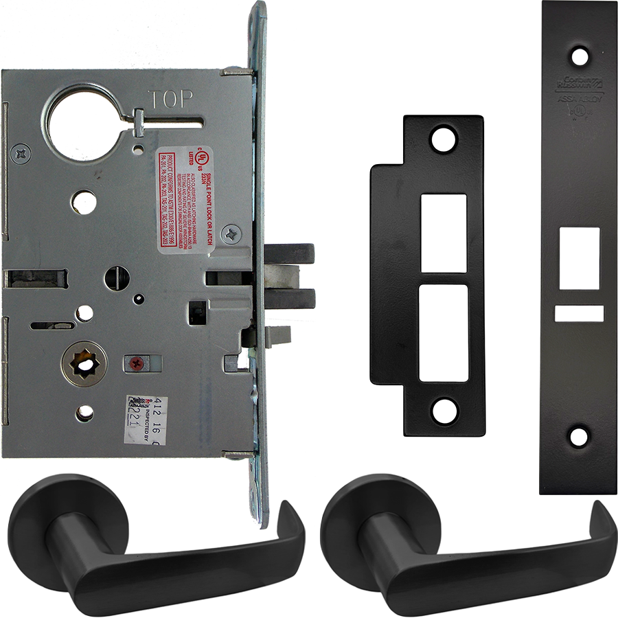KIT - Electrified Mortise, Field Reversible - Fail Safe and Fail Secure, with REX Request to Exit Switch, Newport Lever with A Rose Trim, Less 1-1/8 Mortise Cylinder, Handing is Field Reversible, ANSI Strike SS118, 622/US19/BSP Black Suede Powder Coat