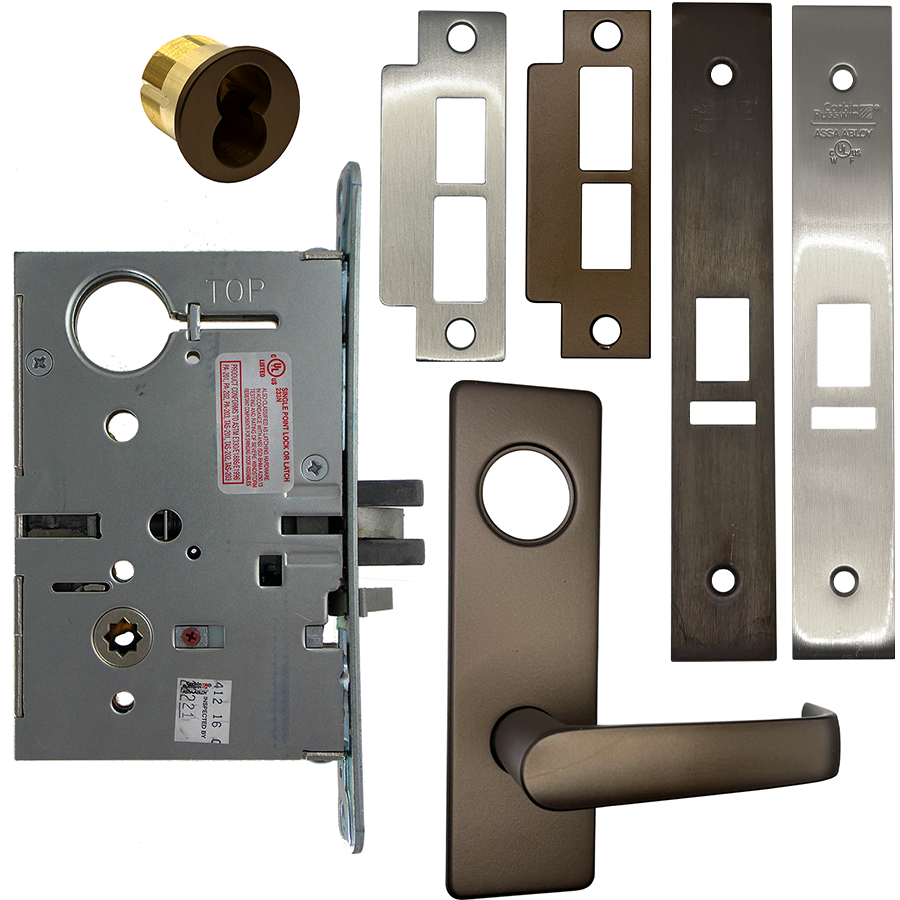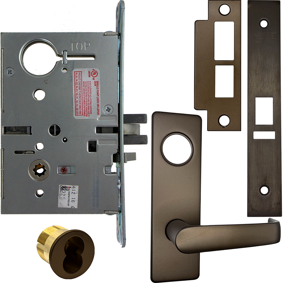 KIT - Electrified Mortise, Field Reversible - Fail Safe and Fail Secure, with REX Request to Exit Switch, Newport Lever with M Escutcheon Trim, LFIC 6-Pin Large Format Interchangeable Core Mortise Housing, A01 Clover Cam, Less IC Core, Handing is Field Reversible, ANSI Strike SS118, 613E/US10BE Oil Rubbed Bronze