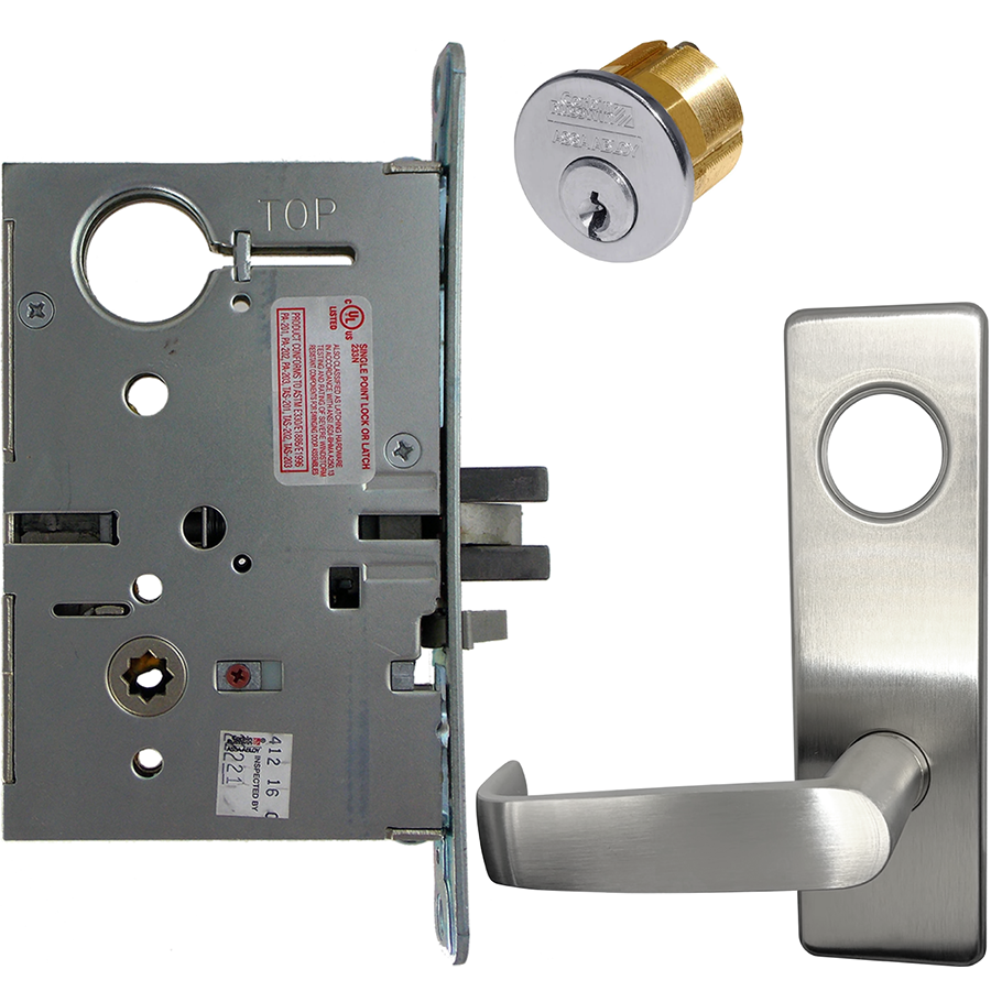 KIT - Electrified Mortise, Field Reversible - Fail Safe and Fail Secure, with REX Request to Exit Switch, Newport Lever with M Escutcheon Trim, Standard 1-1/8 Mortise Cylinder, A01 Clover Cam, L4 Keyway 0-Bit, Handing is Field Reversible, ANSI Strike SS118, 626/US26D Satin Chrome