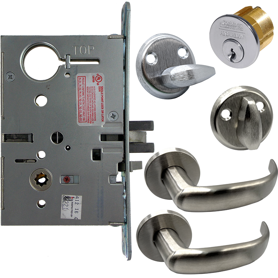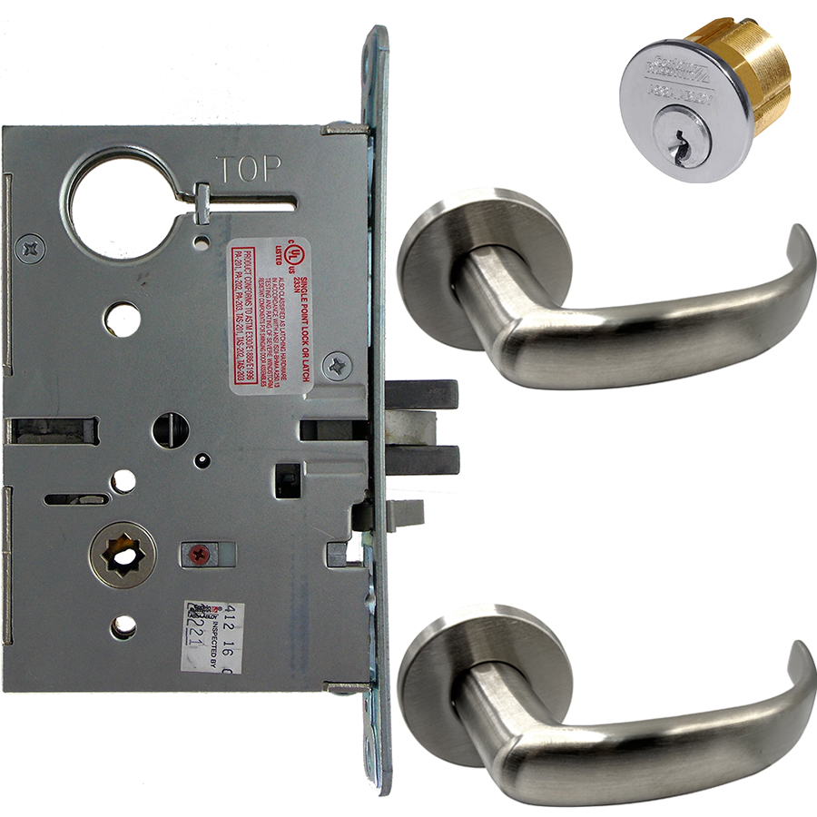 KIT - Electrified Mortise, Field Reversible - Fail Safe and Fail Secure, with REX Request to Exit Switch, Princeton Lever with A Rose Trim, Standard 1-1/8 Mortise Cylinder, A01 Clover Cam, L4 Keyway 0-Bit, Handing is Field Reversible, ANSI Strike SS118, 626/US26D Satin Chrome