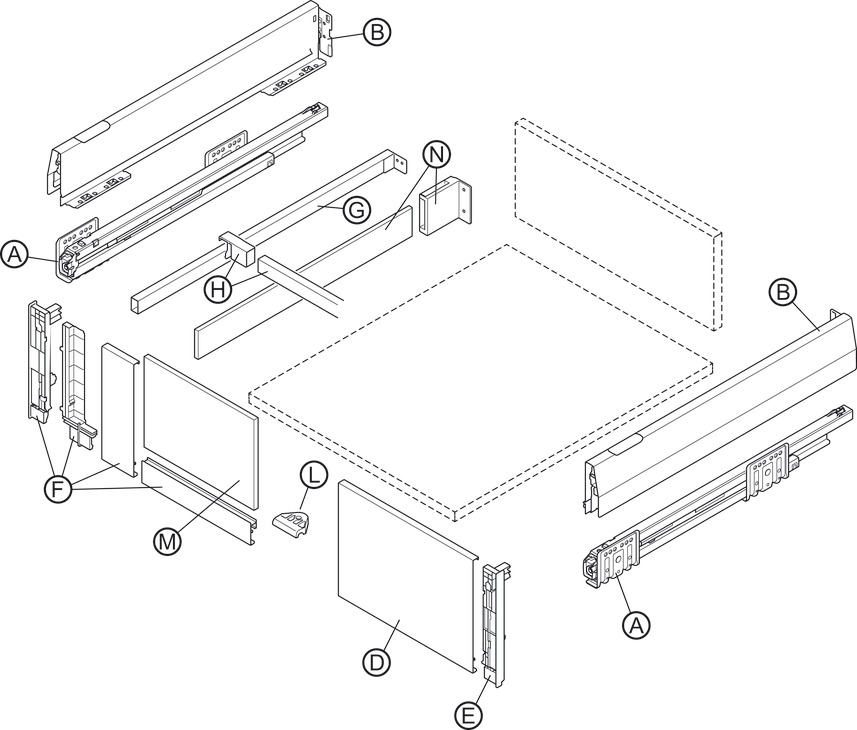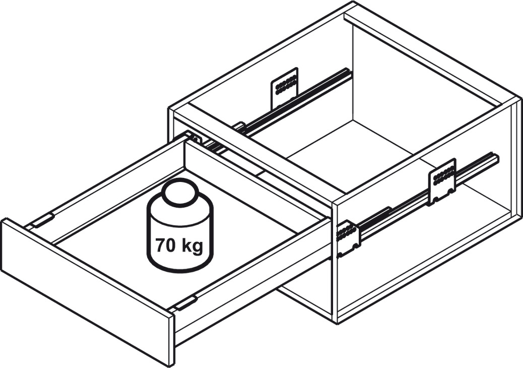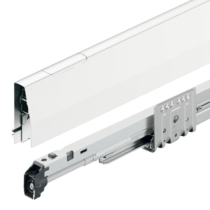 Supplied with: 1 left and 1 right drawer side with rear panel fitting 1 left and 1 right cabinet runner 1 left and 1 right cover cap with Häfele logo relief