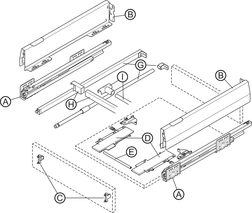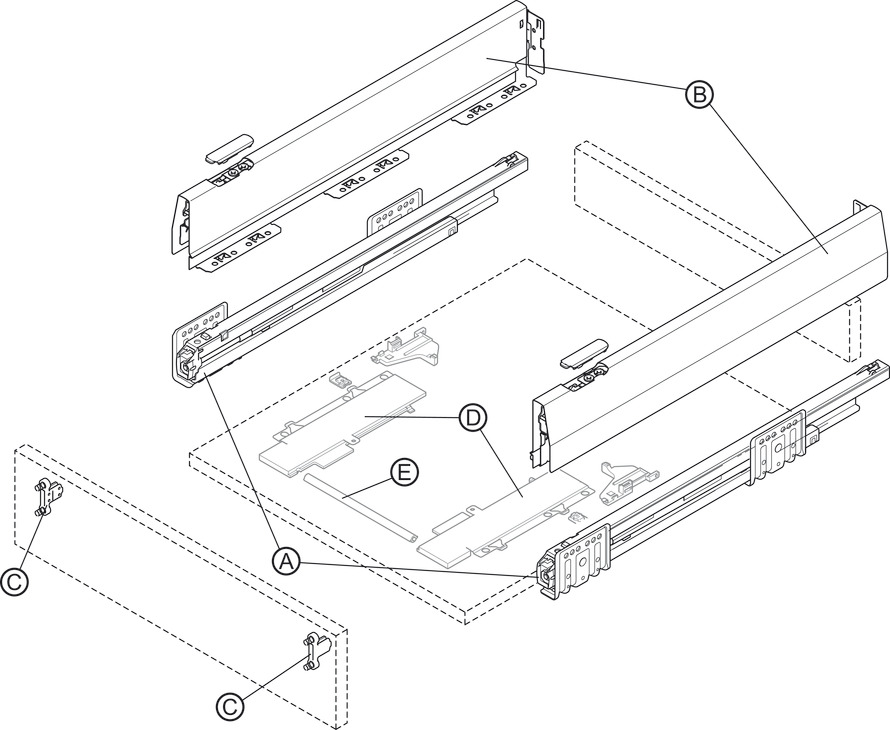 Order reference: Front fixing brackets C for drawer not supplied, please order separately. Please use the screws recommended on the information page for front fixing or guide fixing. Please order components for under sink pull out separately.